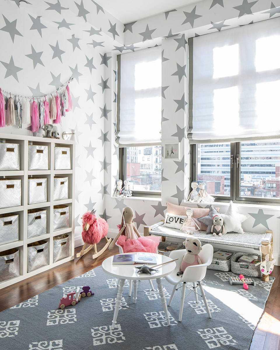 Pro tip: If you’re not papering the walls, applying wallpaper that has your child’s favorite colors and shapes can be a great way to dress up mundane areas and nooks, such as the backs of bookcases and shelves.