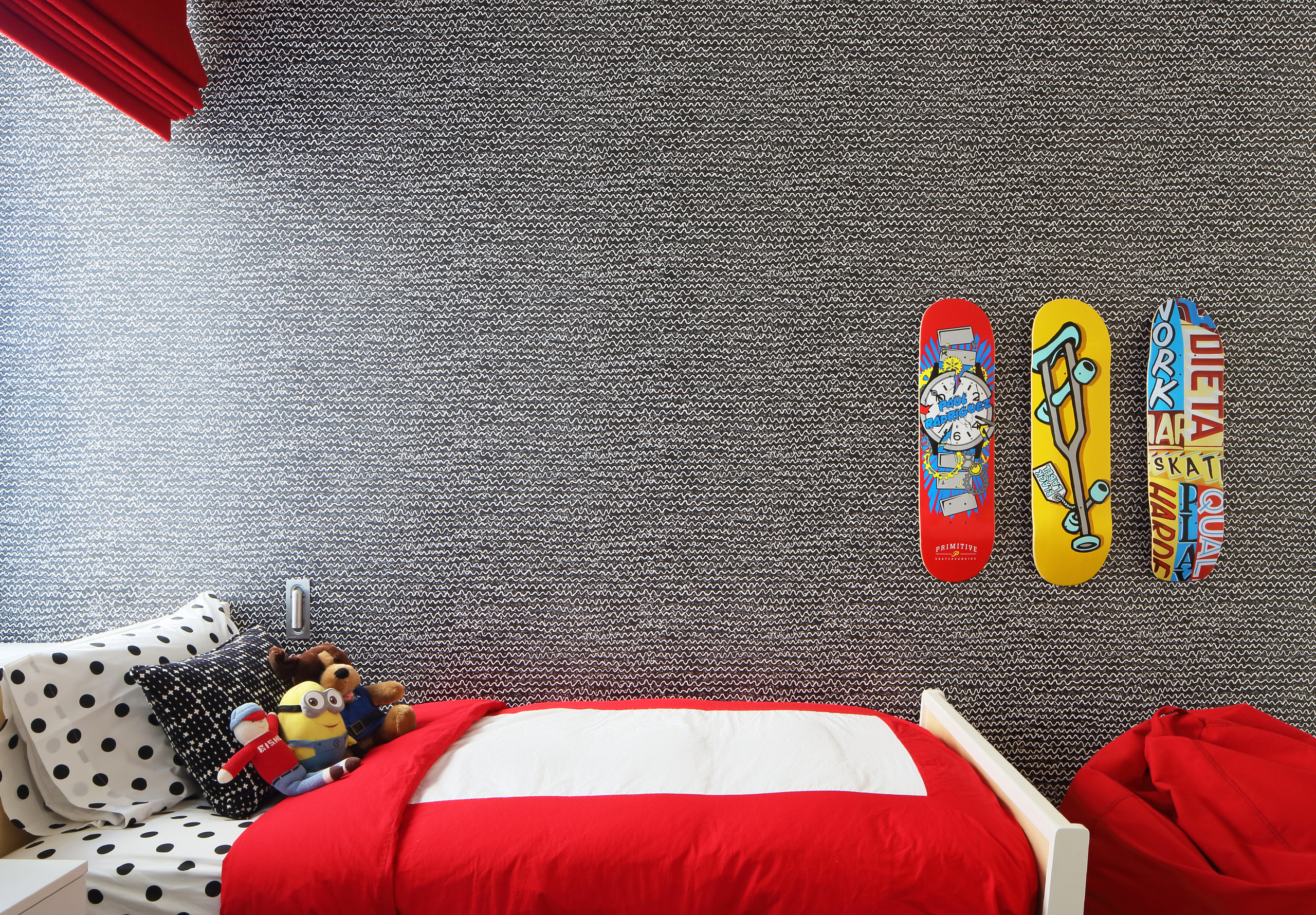 Pro tip: If a dramatic pattern feels too overwhelming for the walls, you can use a more subtle design to highlight your child’s coveted crazes. Black-and-white papers can make colors really pop on a wall and create more drama and interest in a room. Here, a black-and-white paper serves as a sophisticated backdrop for the bold, colorful skateboards. As a bonus, these wallpapers can grow with your child’s evolving taste for years, making it a more budget-friendly option.