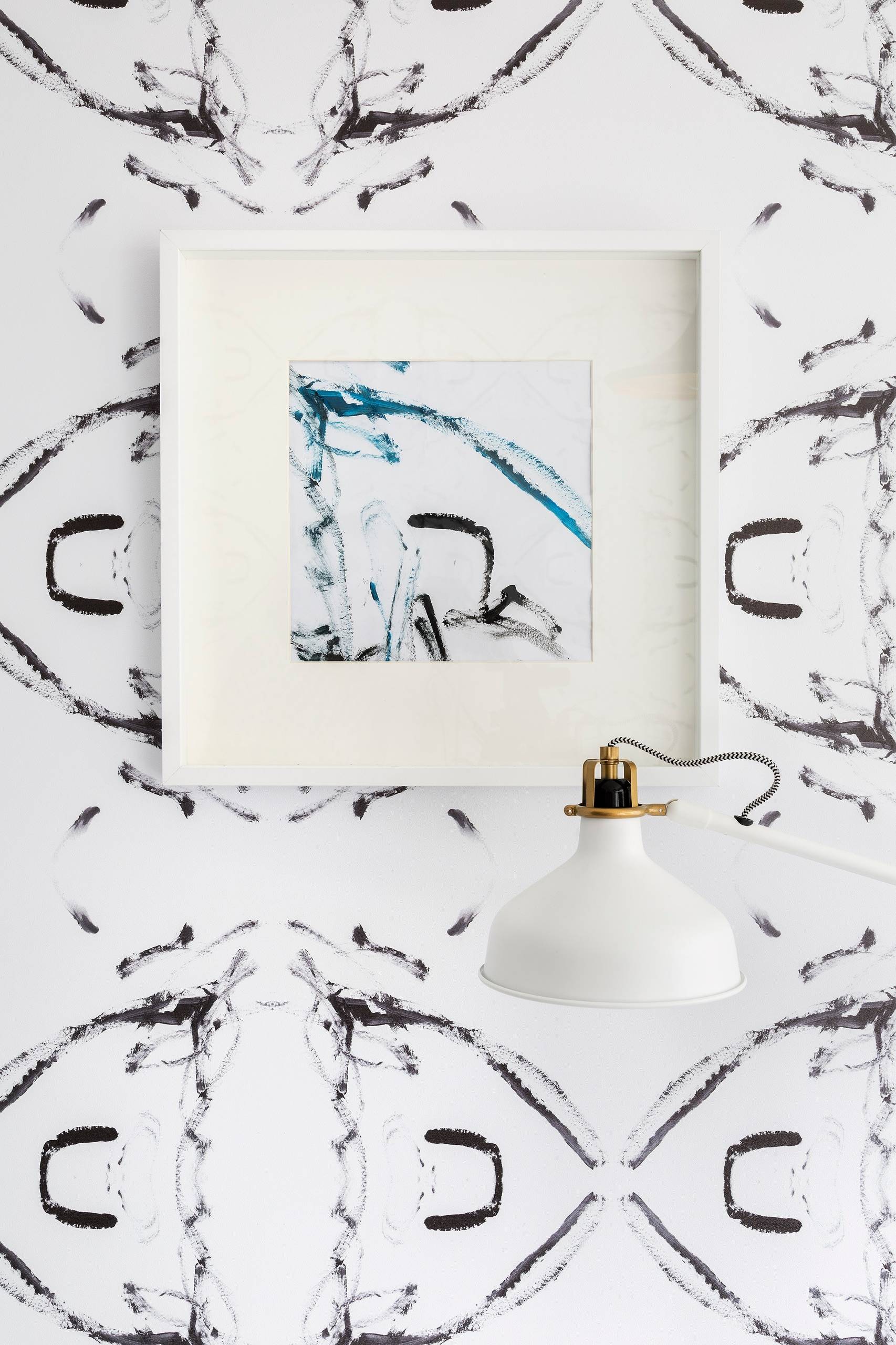 I recently decorated my son’s entire room using one of his early paintings. He was only 3 years old at the time and just learning how to hold a paintbrush. I worked with Digital Printing Specialties outside Detroit to create a pattern repeat using a small section of my son’s painting. In this photo, you can see both the original painting (in the frame) and the wallpaper we created based on it.