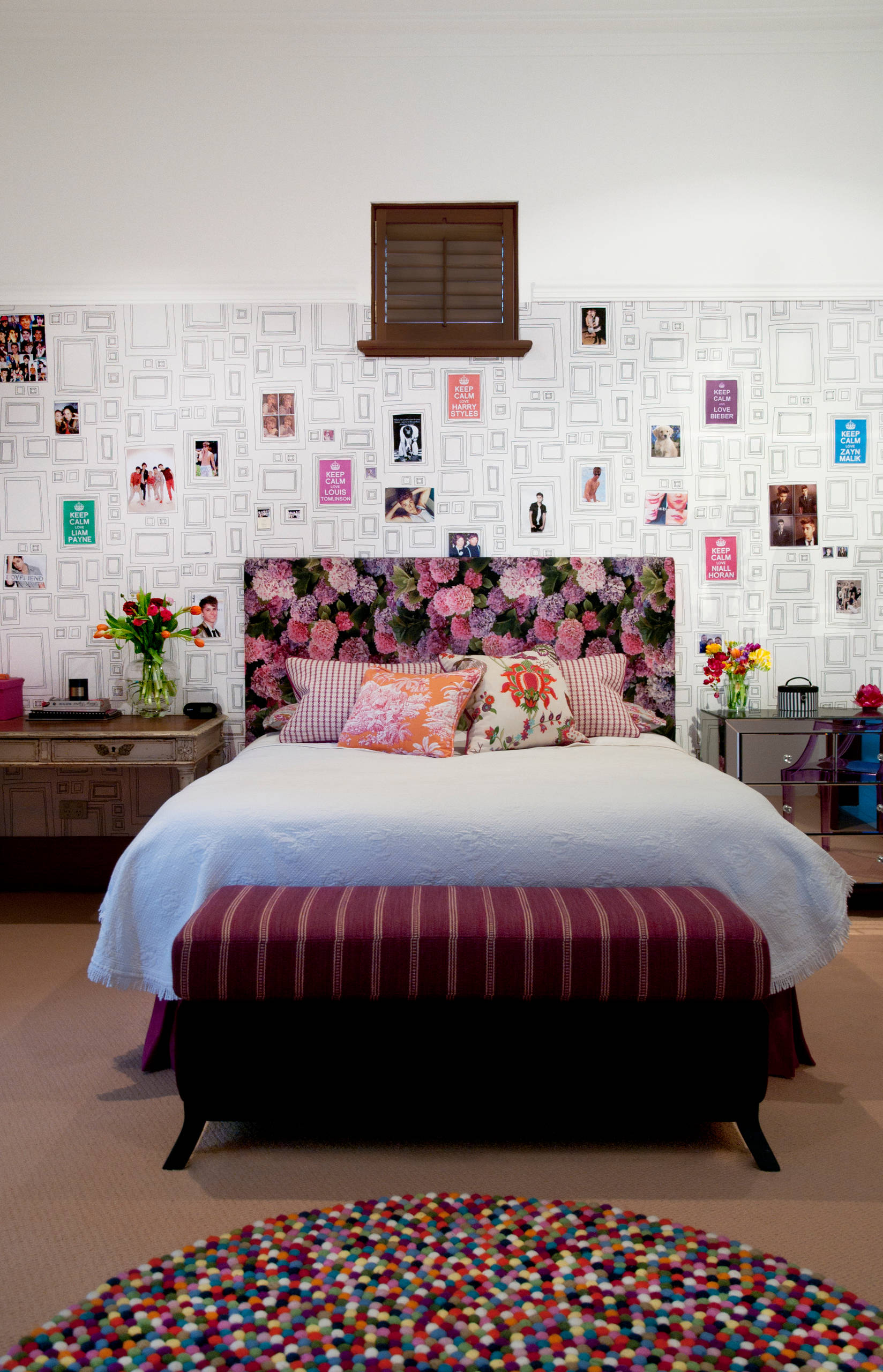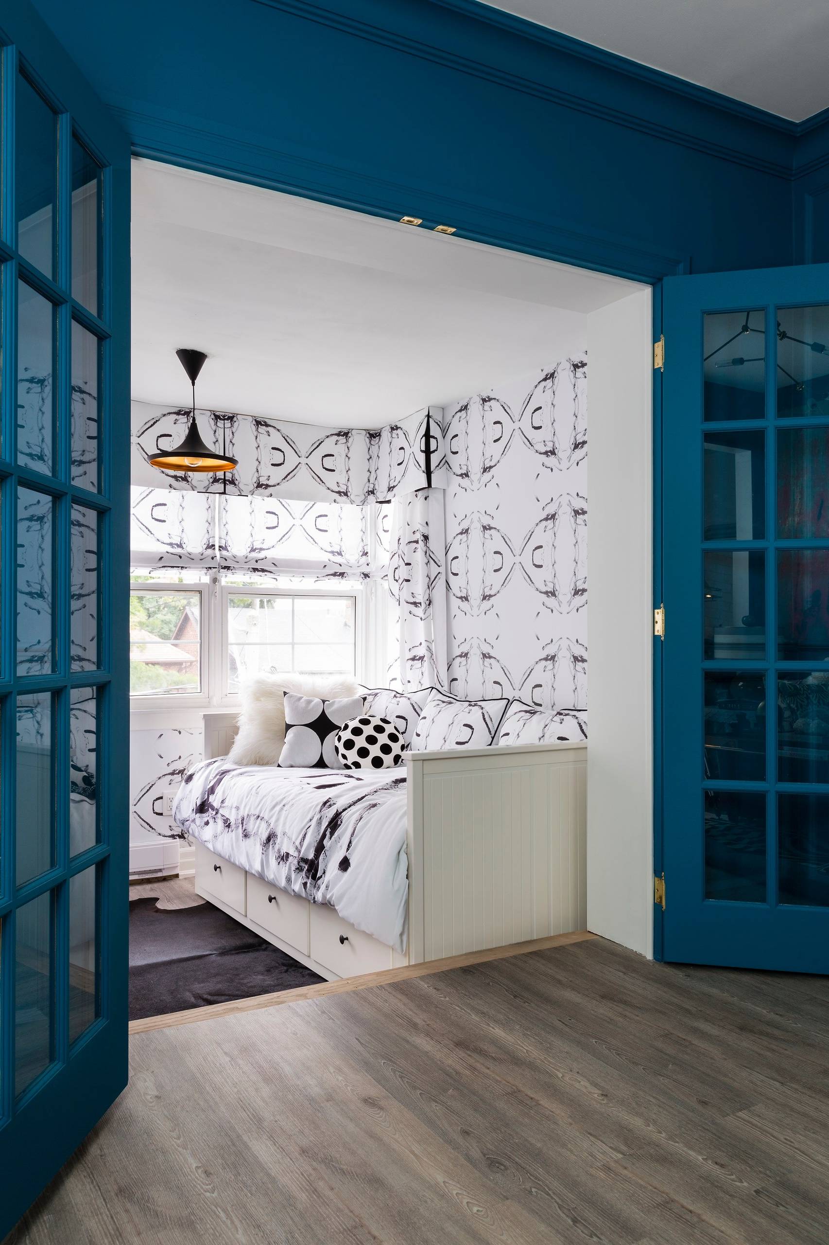 If your child isn’t set on just one color or shape, don’t be afraid to mix it up! Various shapes and color schemes can be combined in interesting ways. In this room, for example, thick stripes painted on the ceiling in turquoise, yellow and white contrast with a smaller-scale half-moon wallpaper pattern in black and white. The daring pairing results in a playful, eclectic look.