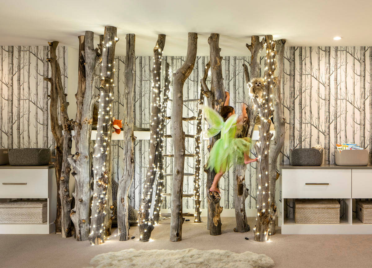 You can go even further with your design by pulling objects from wallpaper patterns and incorporating three-dimensional features in the room, like the wood elements shown in this forest-themed room.
