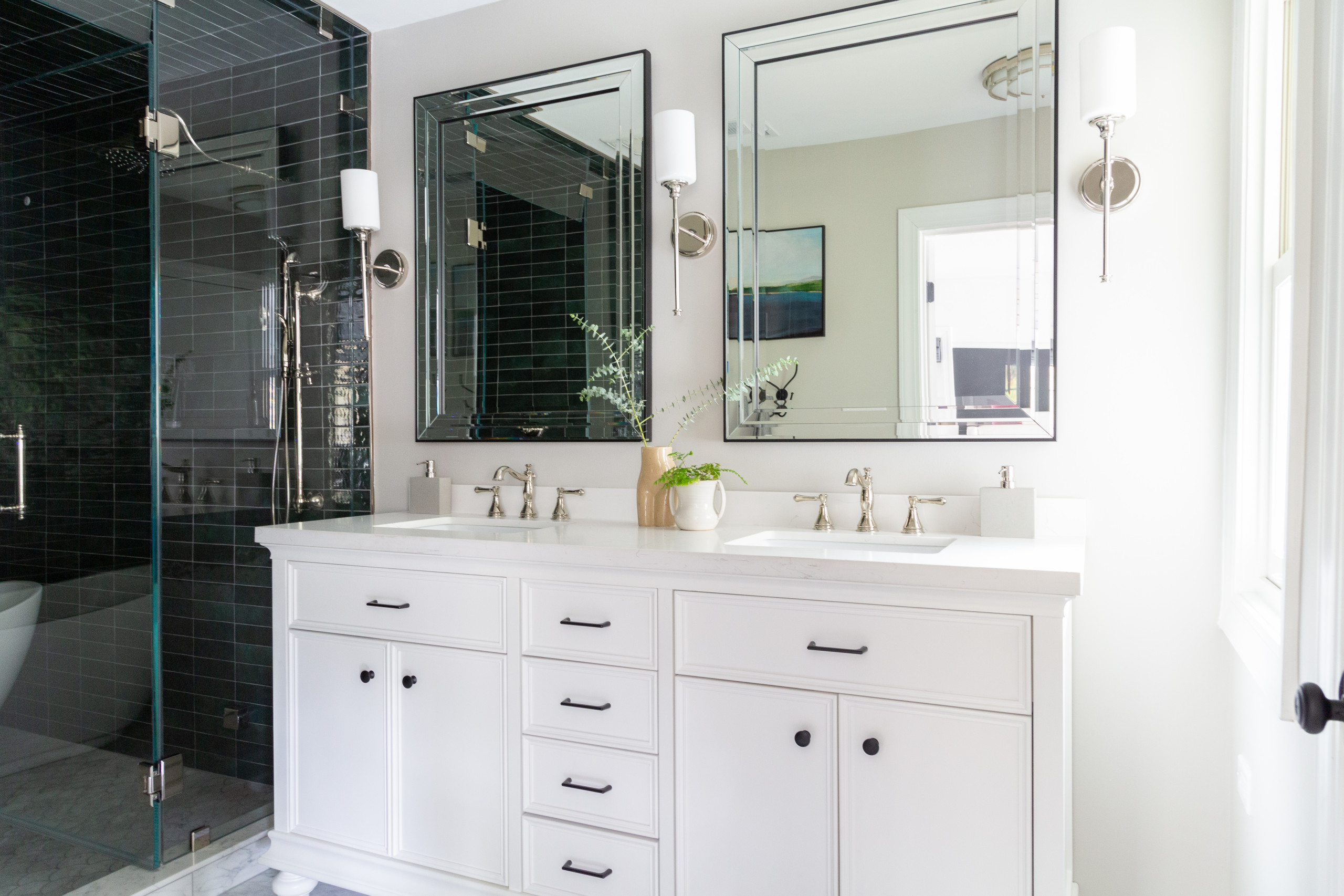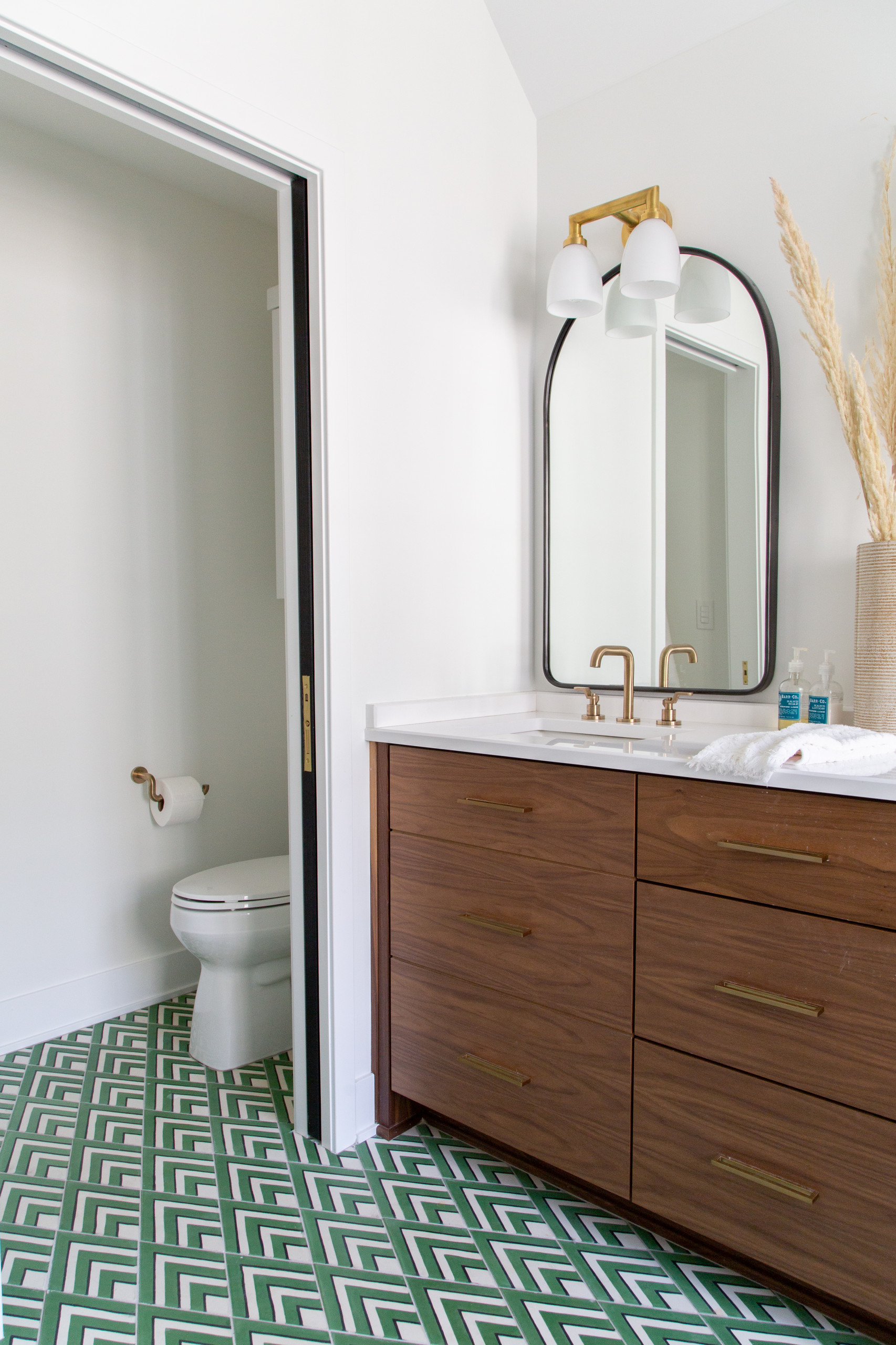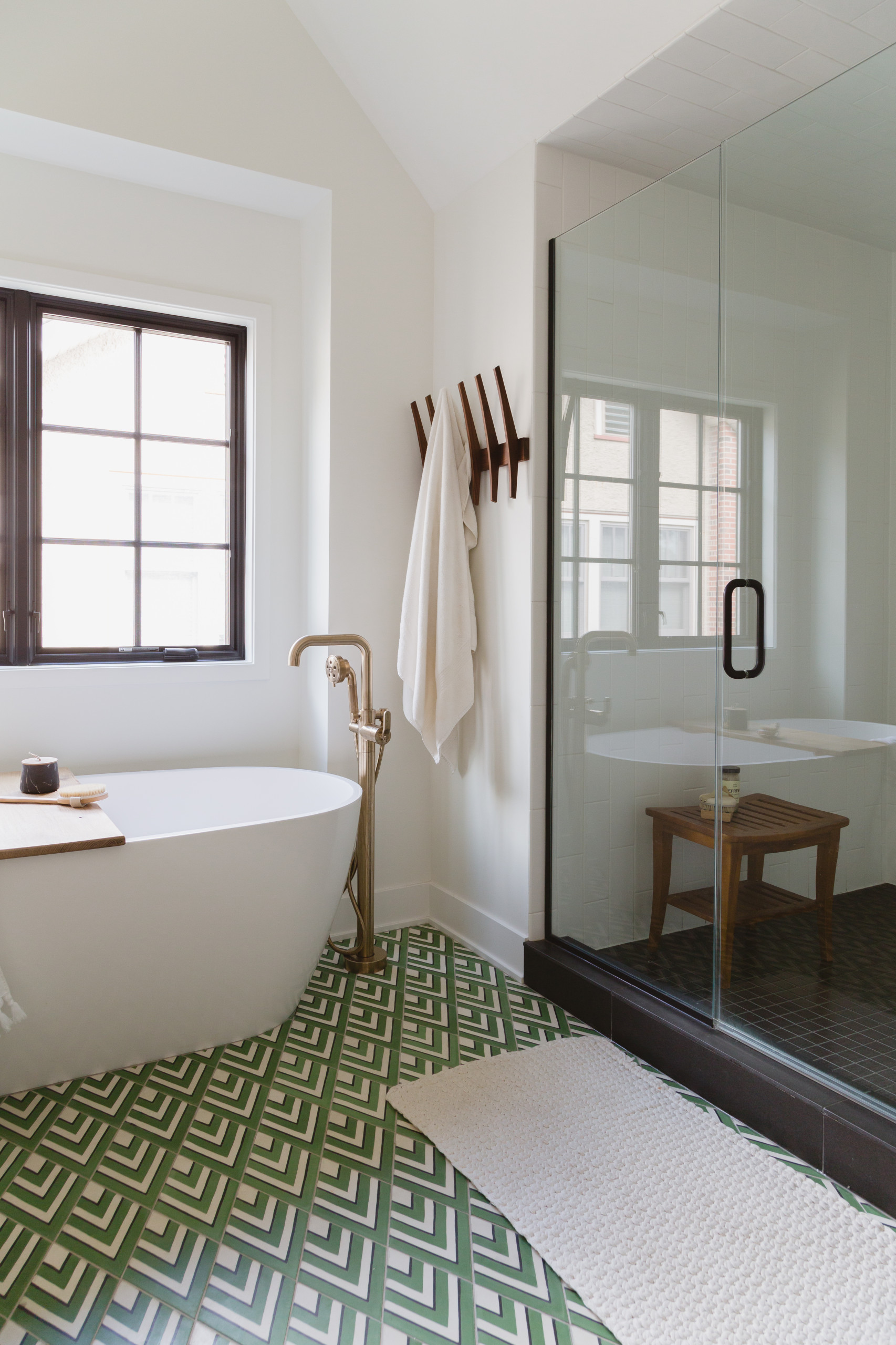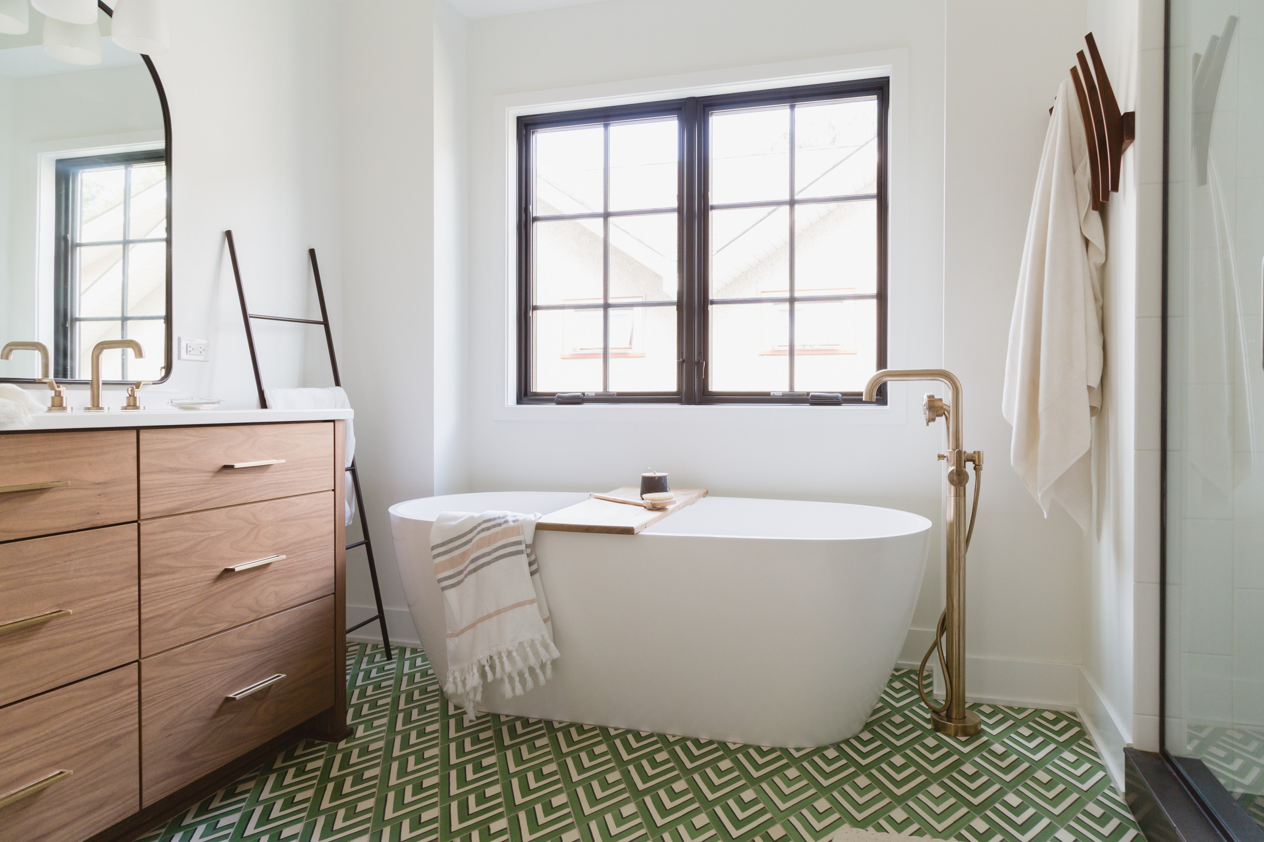 In the couple’s previous master bathroom, an outdated single-basin vanity was situated between the tub and toilet. They had a new custom walnut double vanity installed and the entire space was transformed to include classic elements that relate to the rest of the home. These include black interior doors with brass hardware, walls painted a bright white and trim painted black for contrast. A lively green chevron cement floor tile energizes the space.