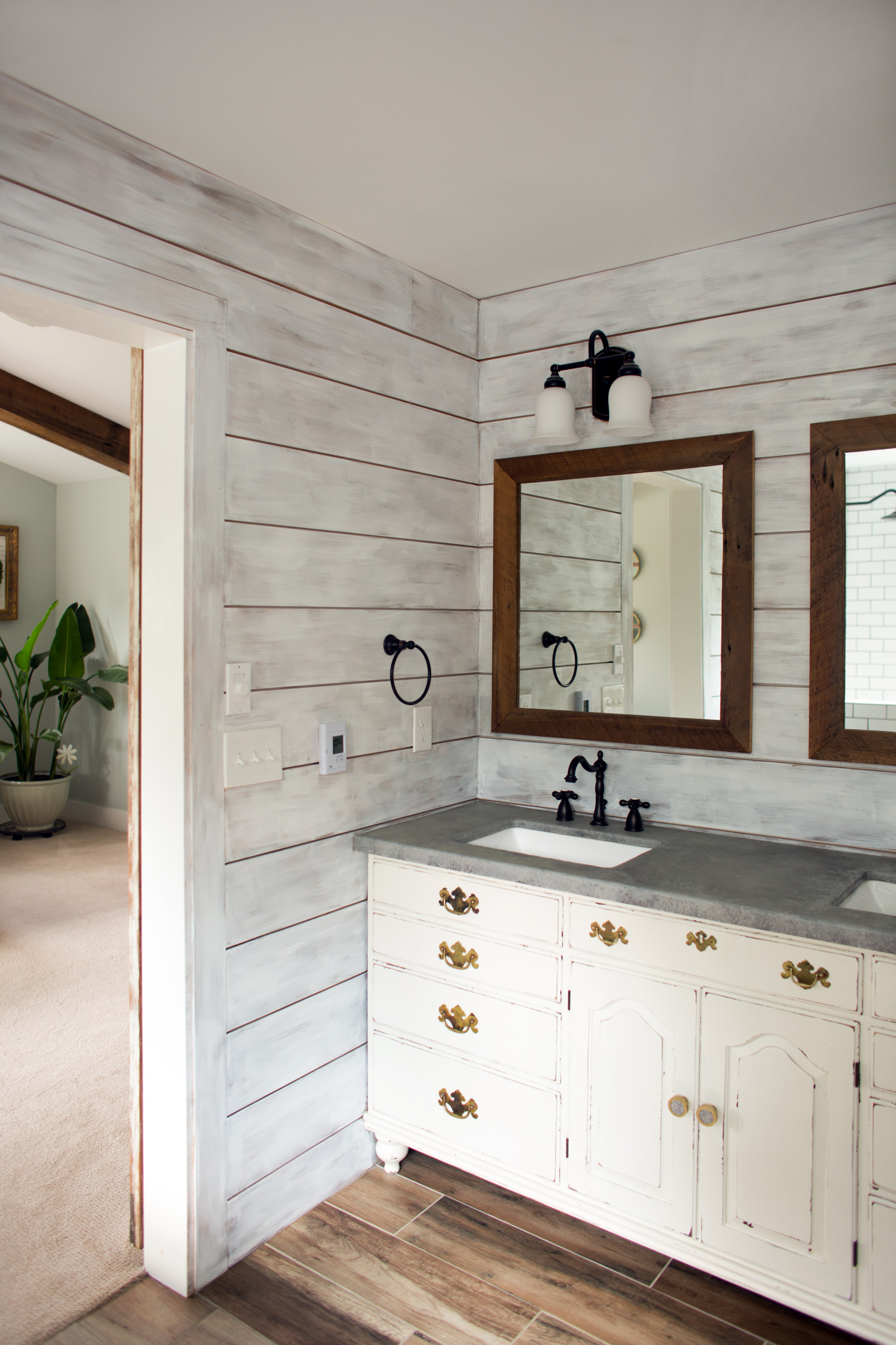The Shorts repurposed a vintage dresser found on Craigslist as their vanity. The custom countertops, made to look like concrete, were fabricated by A&B Granicrete Cincinnati, and the two square mirrors are framed with reclaimed barn wood. Wood shiplap distressed by Amy Carr and Christie Wallace of Salvage Sisters adorns the walls throughout the space.