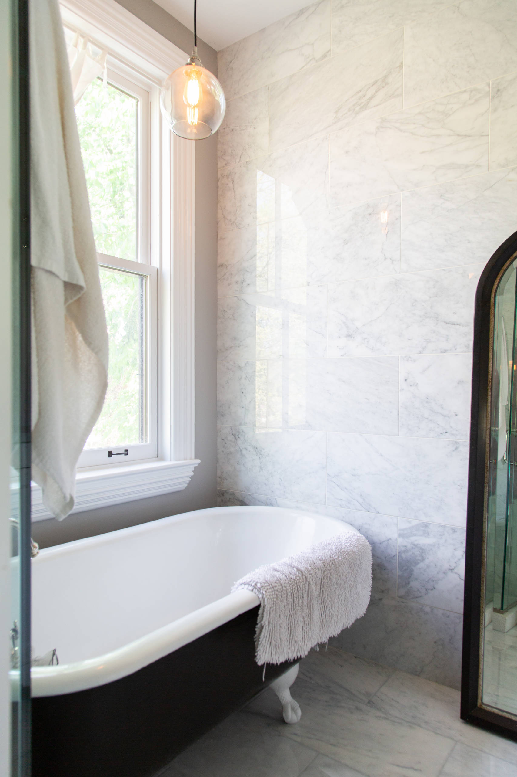 The couple added a walk-in shower (just visible in front of the tub) and repurposed the tub. “The claw-foot tub is original to the house. We ended up building the bathroom around it,” Kitsos says. The couple repainted the outside of the tub but didn’t need to reglaze the inside. Its dark exterior contrasts with the surrounding marble walls.