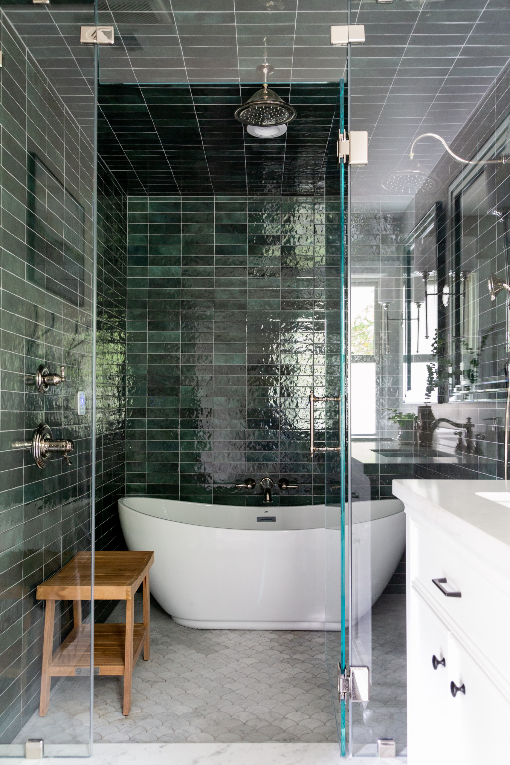 The generously sized walk-in shower area features a freestanding tub. The walls and ceiling are encased with a glamorous glossy green glazed ceramic subway tile. The floor features marble scalloped tile. The couple plan to seal the marble floor tile every year.