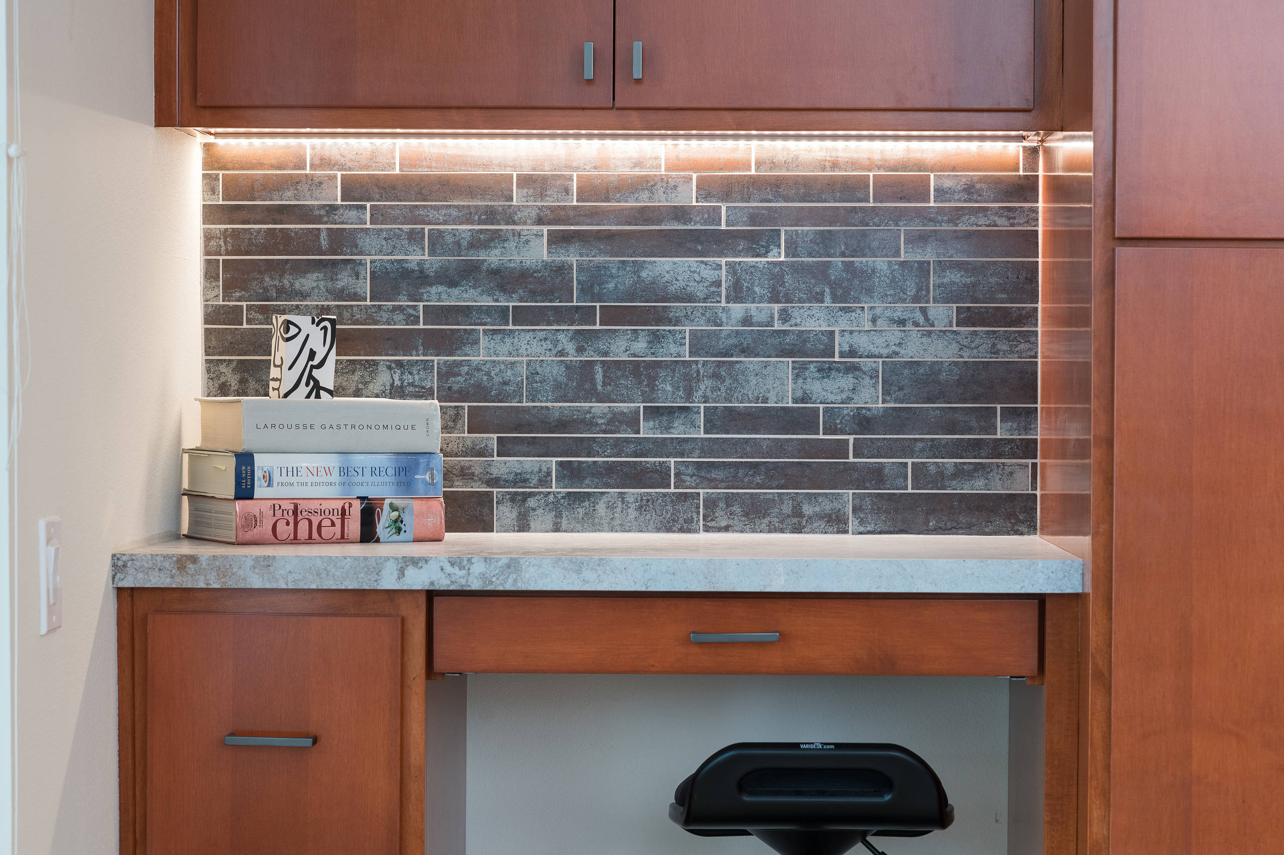 Don’t count on your kitchen’s overhead lights for proper reading light. Undercabinet lighting can keep the desktop clear and illuminate the area.