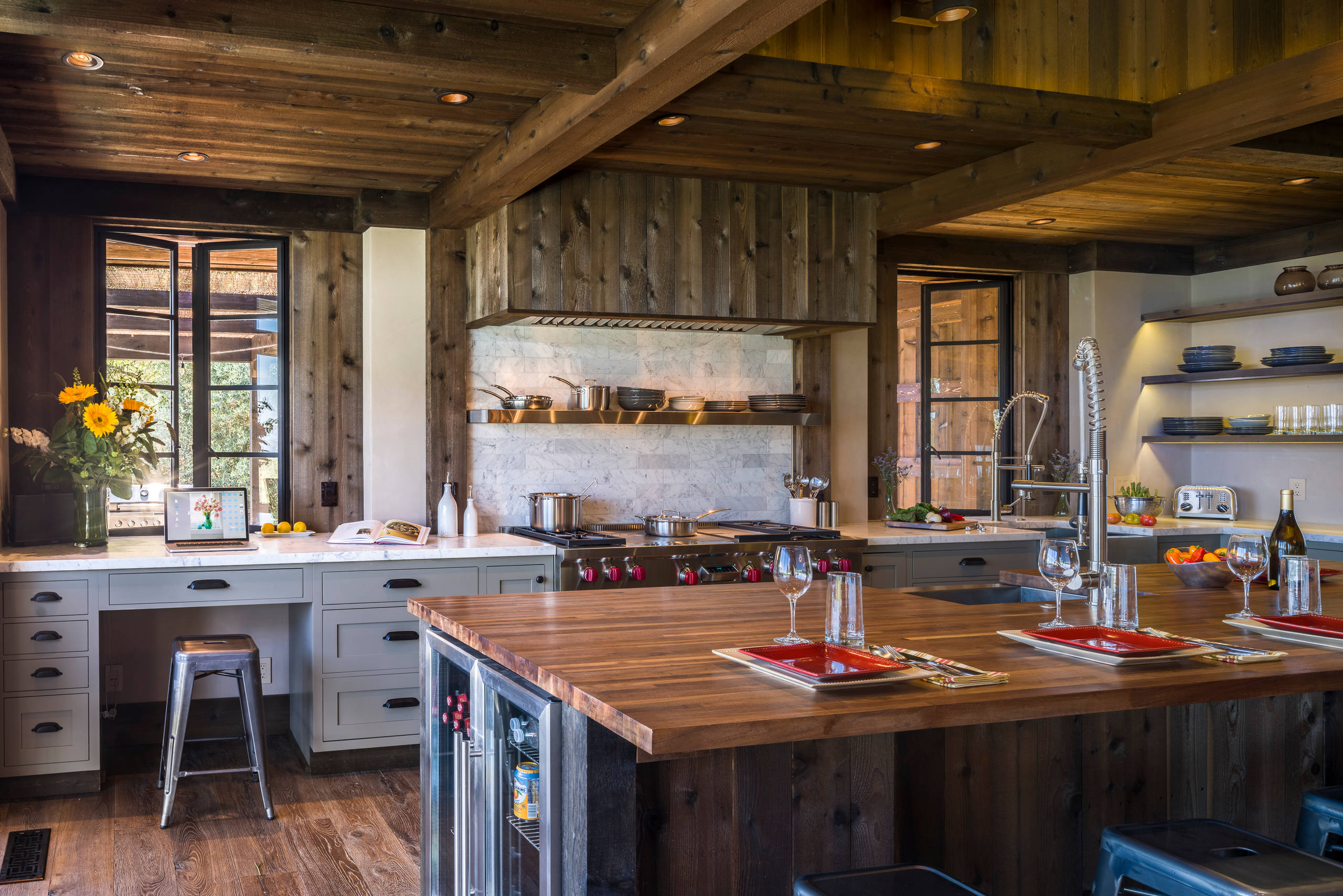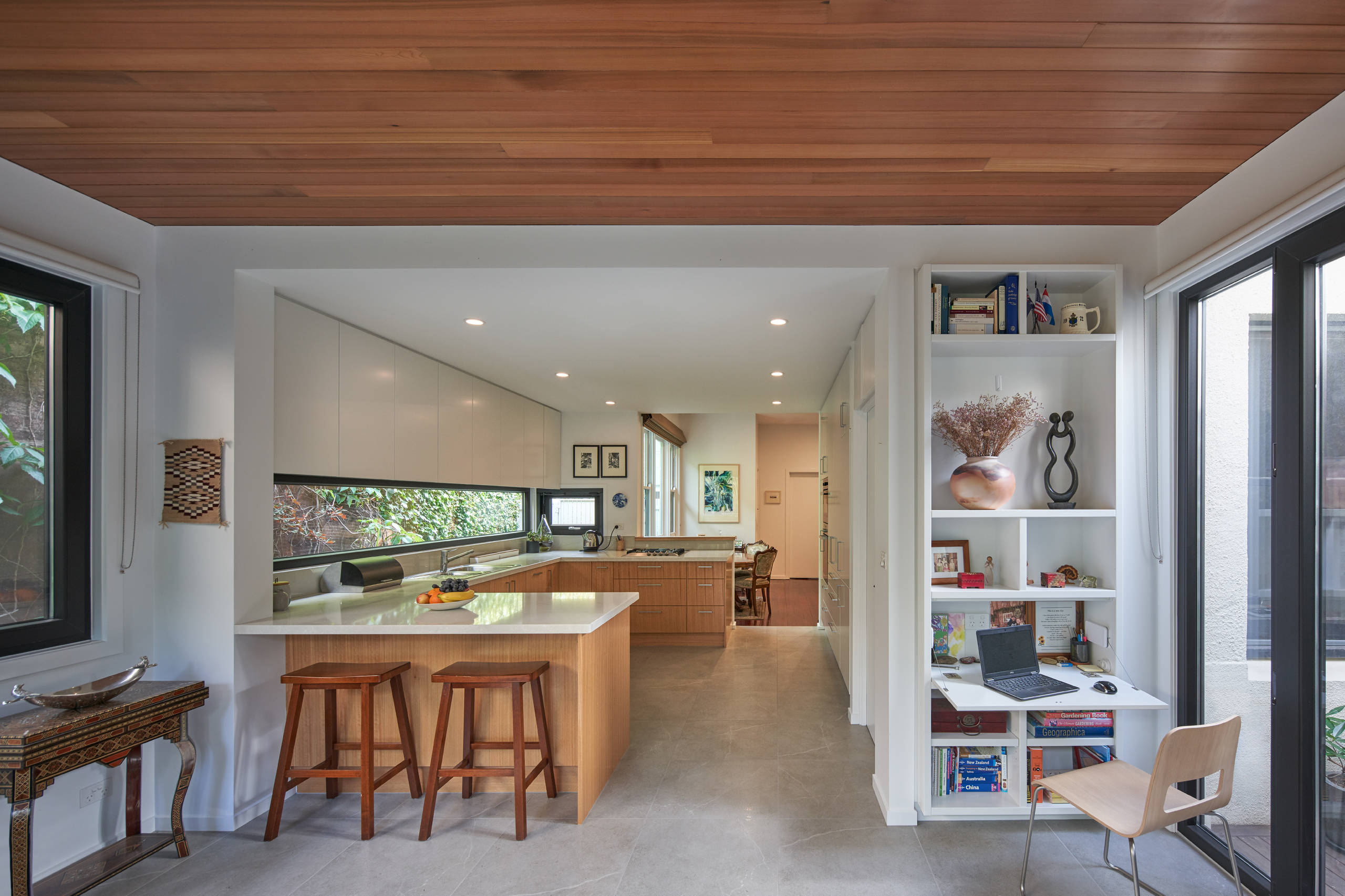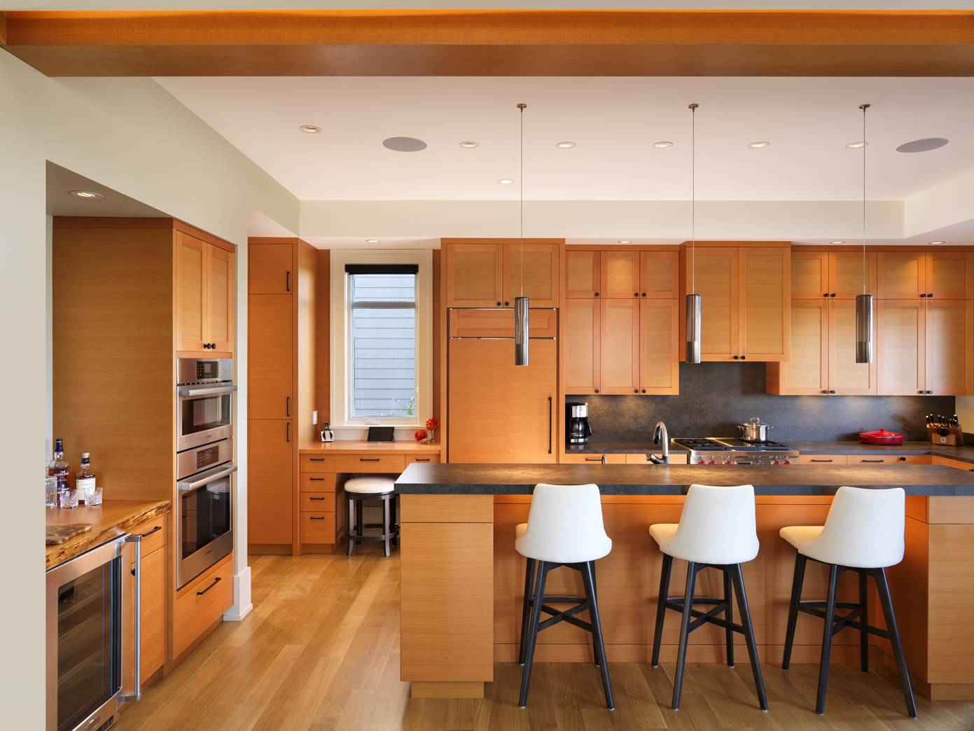 This wall-mounted desk is part of the kitchen but is tucked just beyond the cabinetry and work zones. The desk is a stone top and a floating drawer held up by steel brackets.