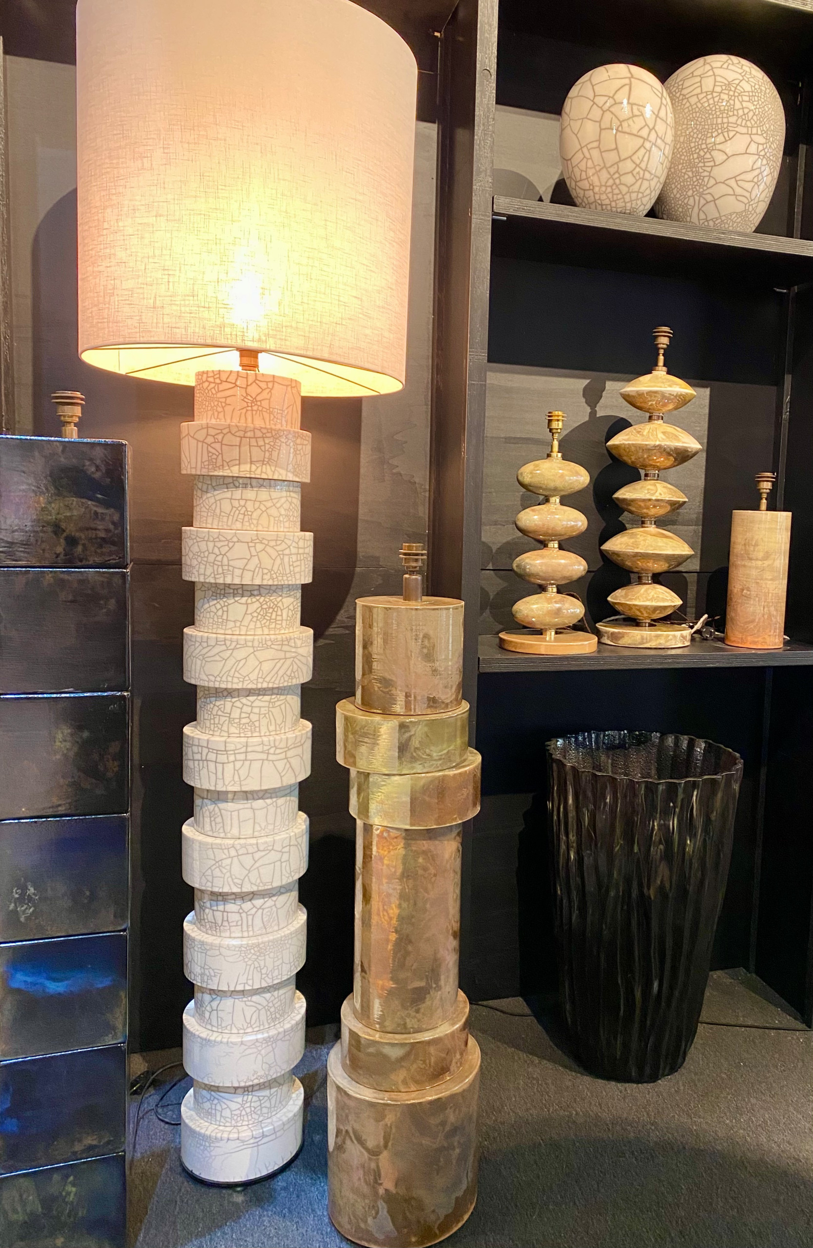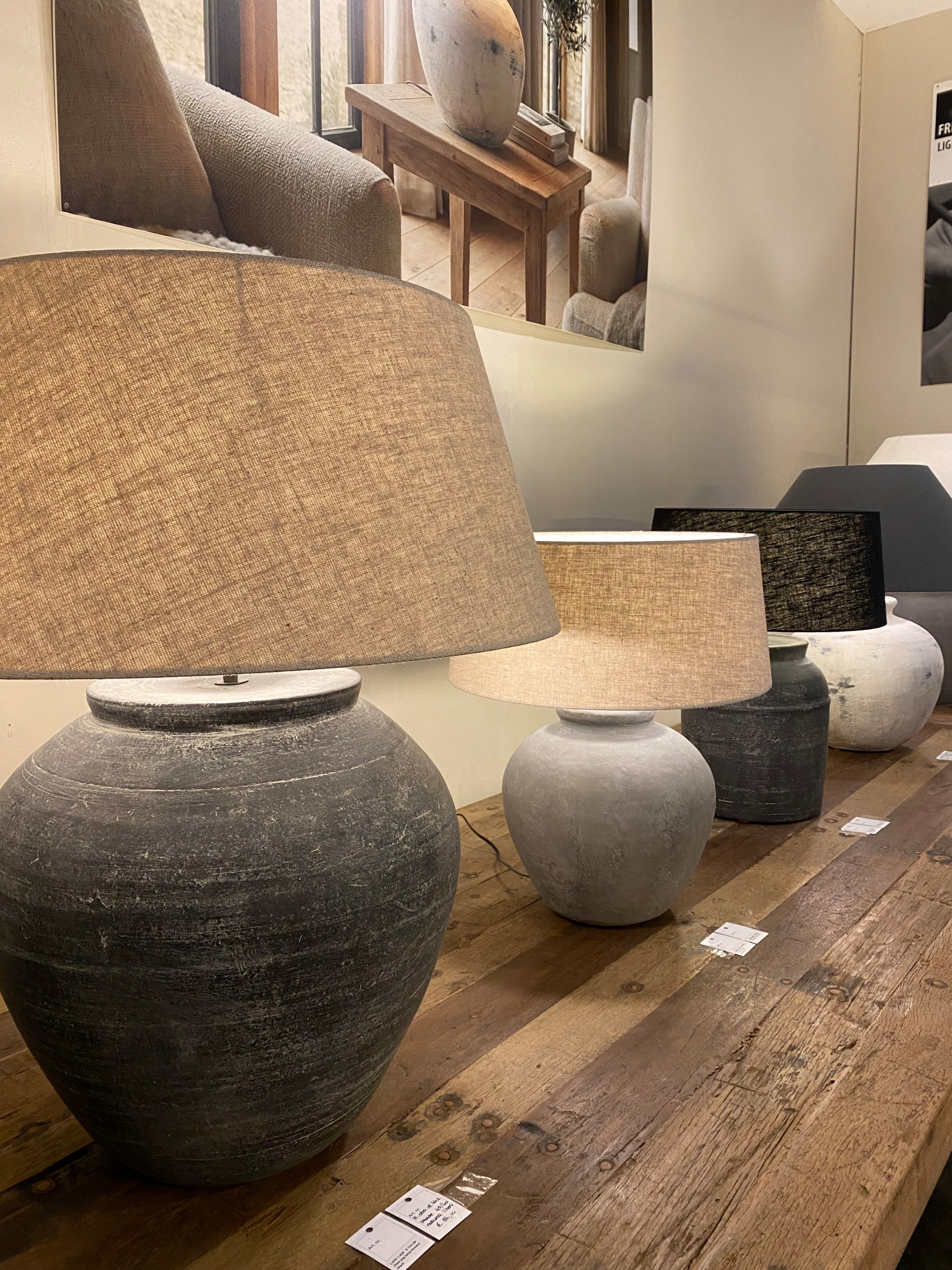 Lamps with generous, sculpted bases reminiscent of Greek and Roman pottery were key to many of the lighting collections, including these from Frezoli Lighting.
