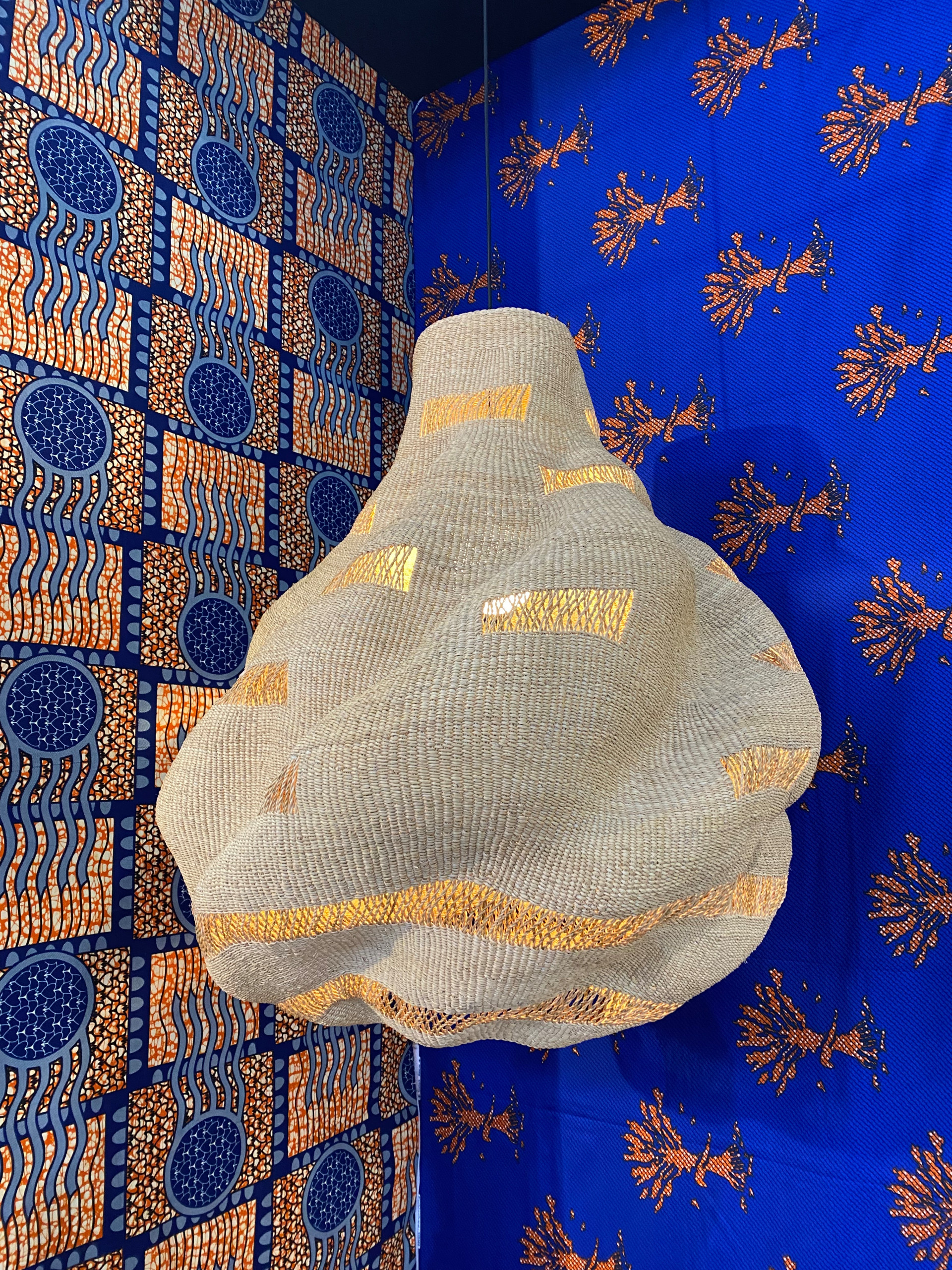 The Baba Tree Basket Co. showcased items woven from elephant grass by the Gurunsi community in Bolgatanga, Ghana. Each has an intricate and artistic handmade shape, as seen in the pendant light shade pictured here.