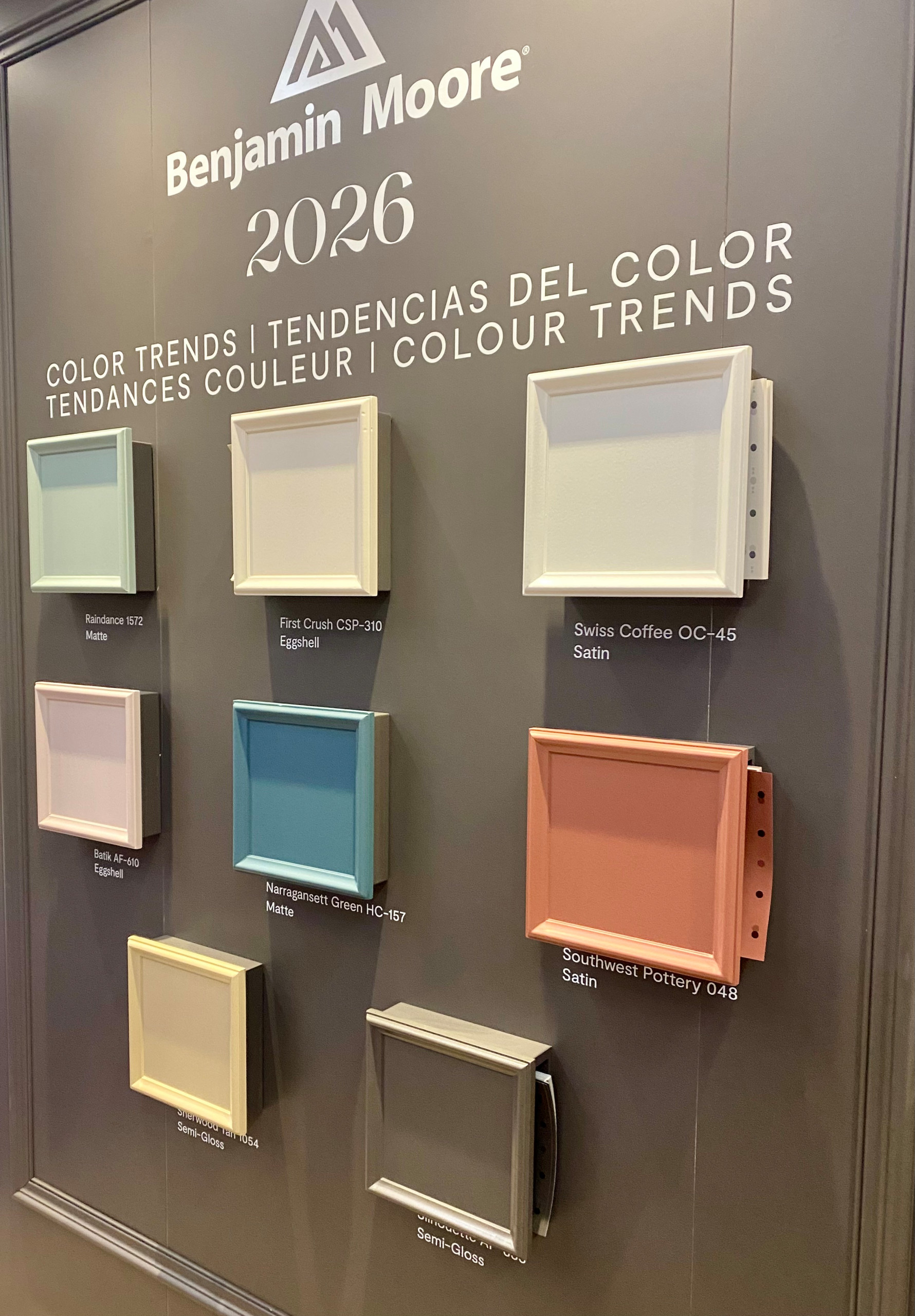 Benjamin Moore’s 2026 color of the year, Silhouette, is a refined midtone that complements Swiss Coffee, Sherwood Tan and Southwest Pottery to form a grounded palette befitting this sophisticated trend.