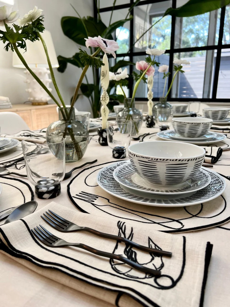 Elevating mealtimes is central to Misette’s collections. Its embroidered linens add personality and fun to a tablescape.