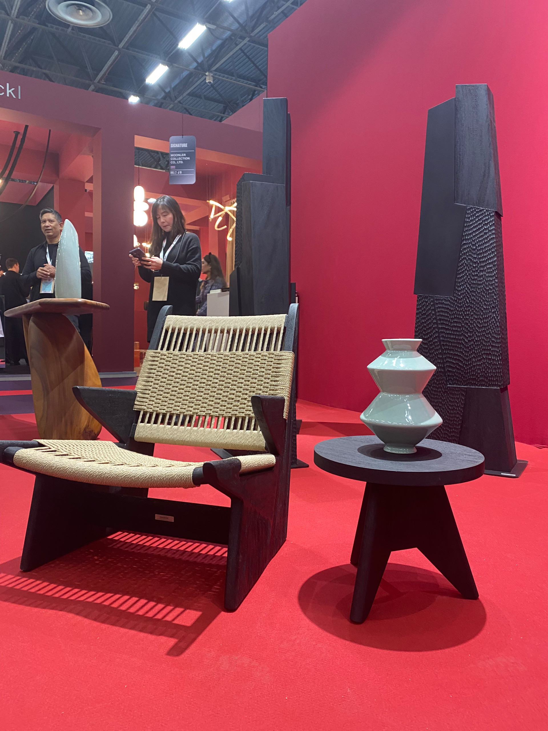 Moonler, with roots in Thailand, celebrates traditional woodworking and weaving techniques in the region of Chiang Mai using local craftspeople to create timeless furniture. The Phaka armchair in wood features a woven seat made by hand but using high-quality modern tools.