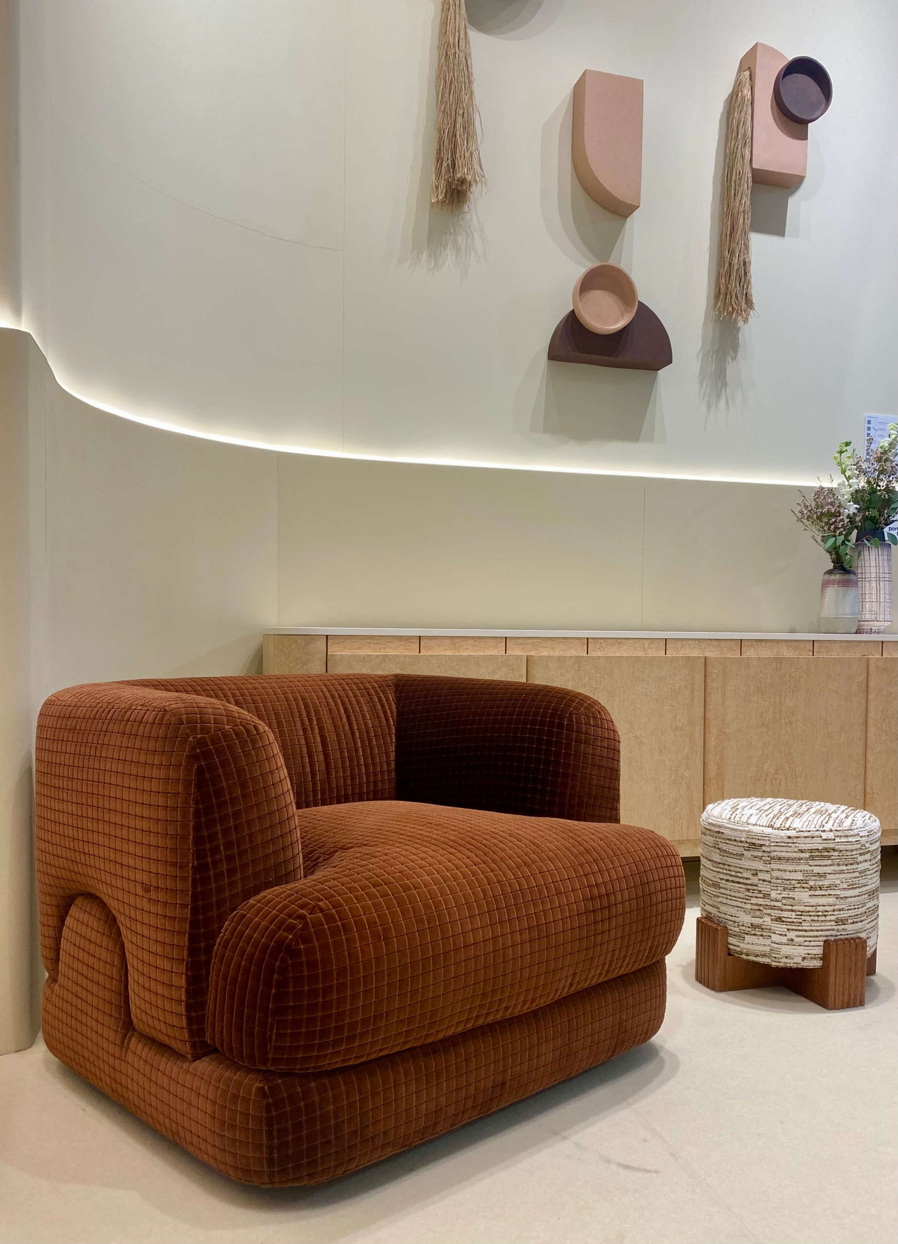 Rounded shapes were seen across product lines, from side tables to bed frames, seating to storage. Dooq debuted its Mosaico upholstered collection by Studiopepe, including this armchair combining a solid base with a soft, architectural form. Passe Partout also offered curved armchairs, with the addition of a swivel mechanism.