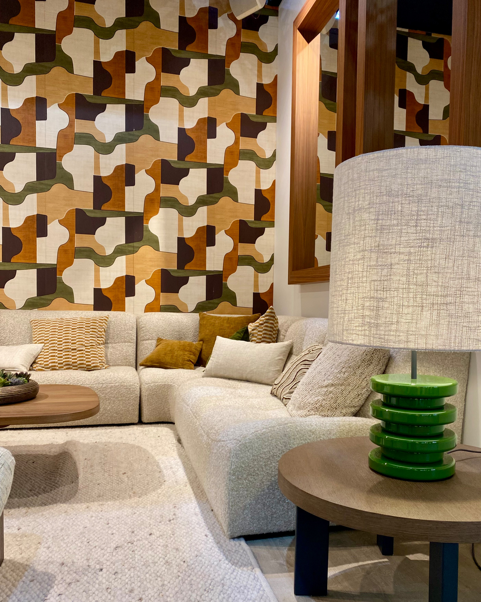 In many instances, two big trends combined. Warm neutral hues were applied to curved furniture, such as in this Eichholtz dining room design. Also featured was a new lighting collaboration between the brand and interior designer Corey Damen Jenkins.