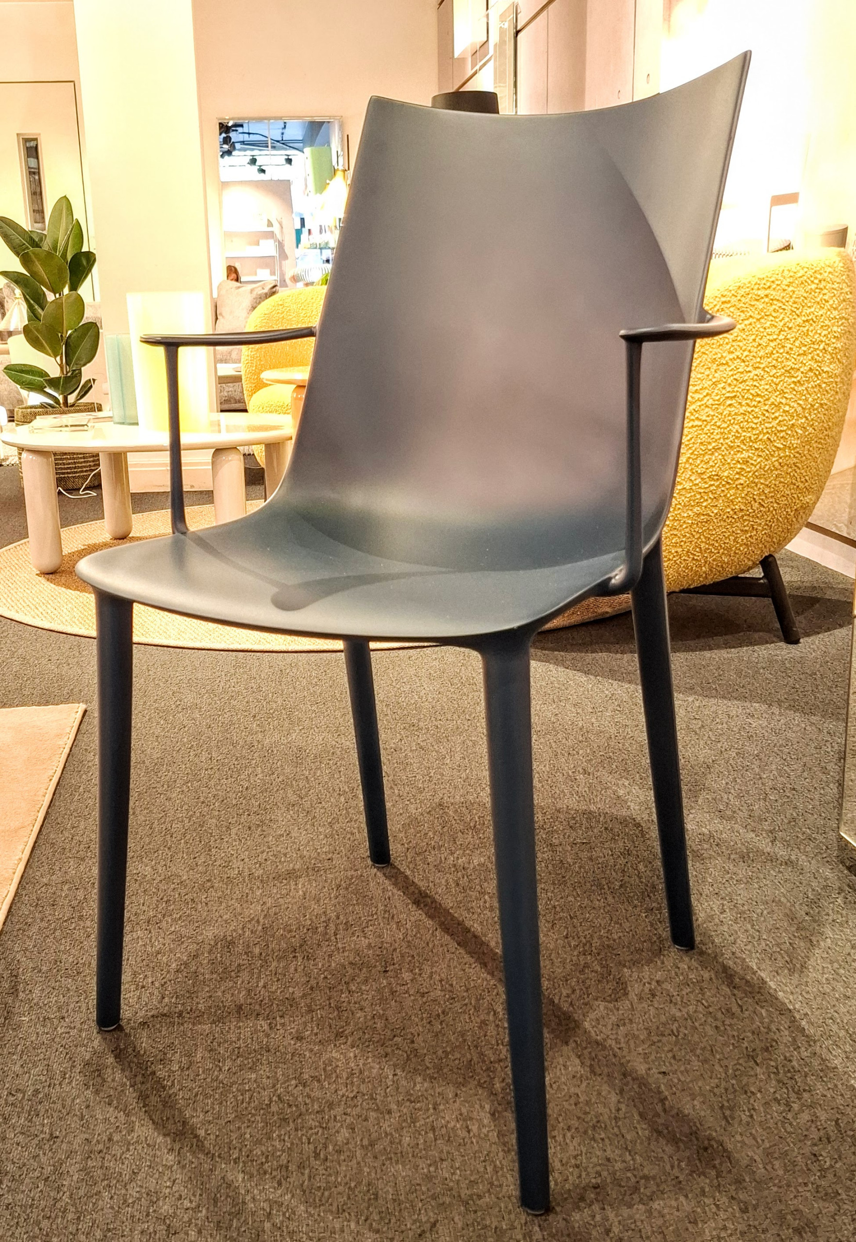 Nearby, Kartell was showcasing its HHH chair by Philippe Starck in a matte version of the shade. For this brand, burgundy has been the color of the moment for a while, and this deep indigo color complements that beautifully.