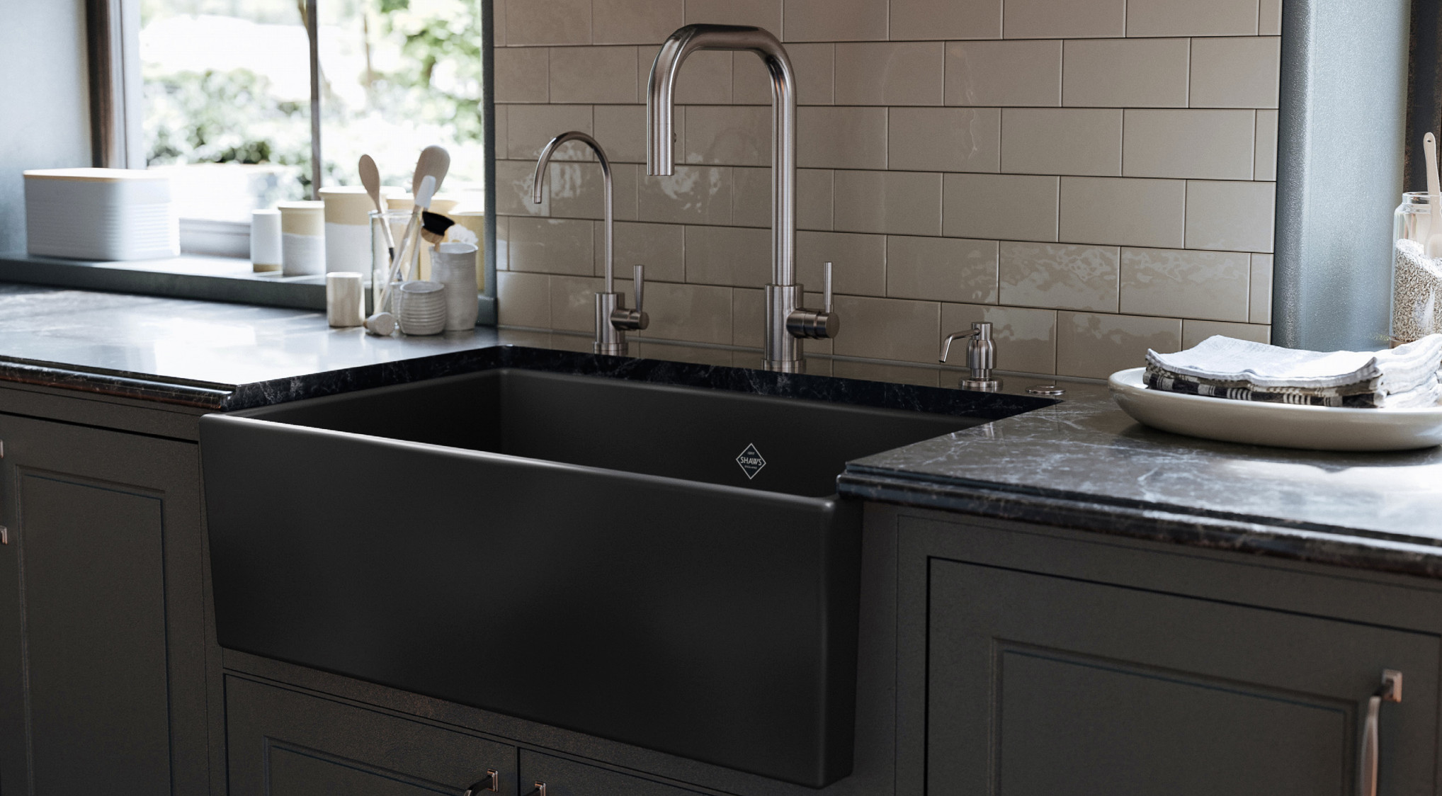 For example, instead of rounded corners, the matte black Shaker apron-front fireclay sink from Shaws shown here features a more modern rectangular shape with squared-off sides and thinner walls. The sink currently comes in white and parchment fireclay colors. Matte black and matte gray will be available in June 2021.