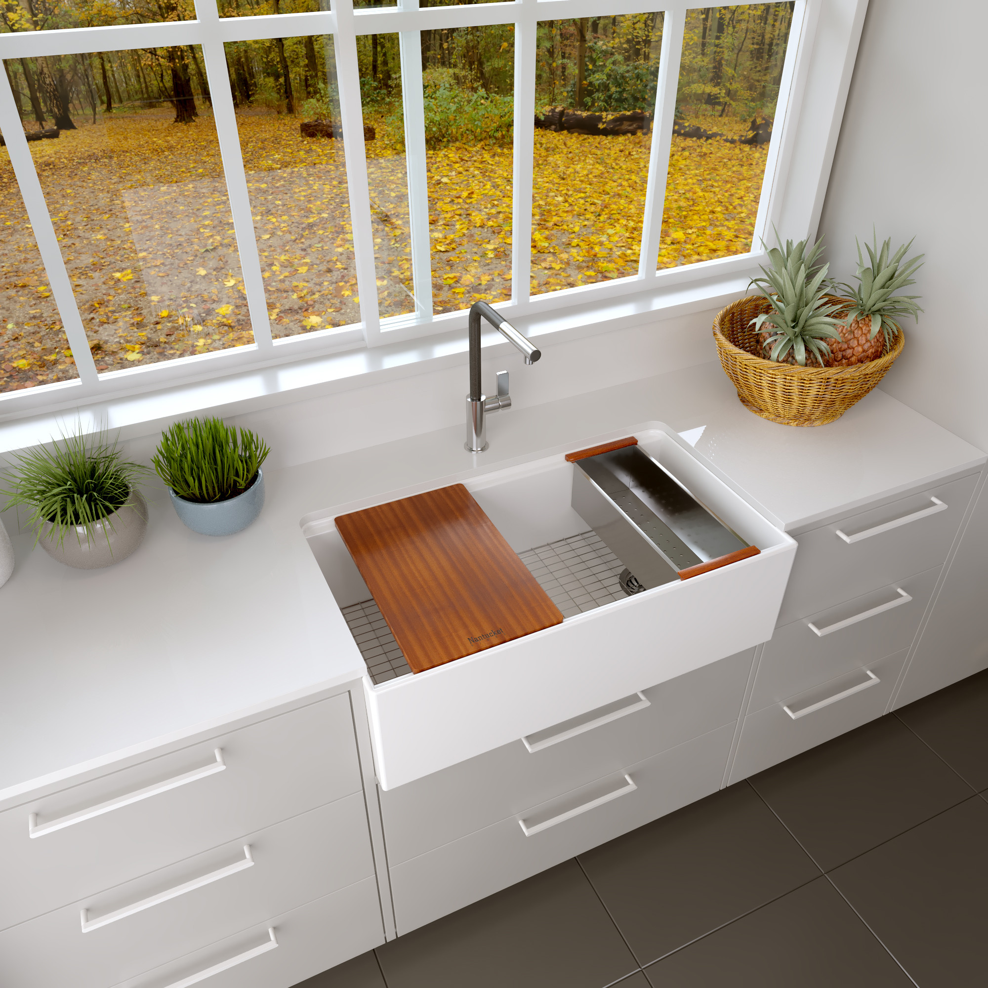 In addition, the sink has a shelf inside that keeps sponges and scrub brushes accessible yet hidden at the front of the sink. It comes with the reversible rack, drain cover and drain. The cutting board, large colander and small colander are sold separately.