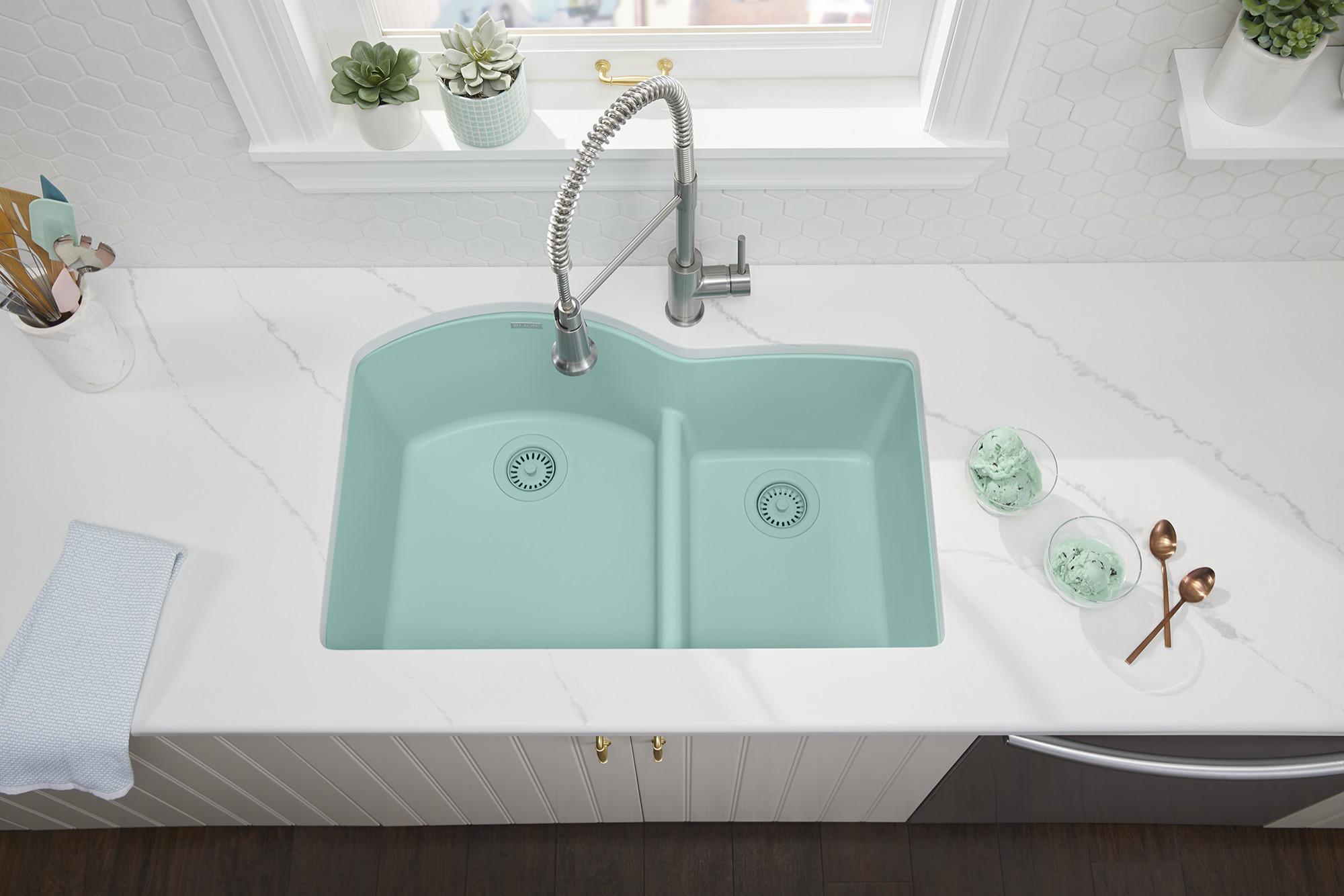 Manufacturers are also offering a rainbow of colors for various sink styles. At KBIS 2020, Elkay previewed the Mint Crème color shown on the sink here. It’s now available for purchase.