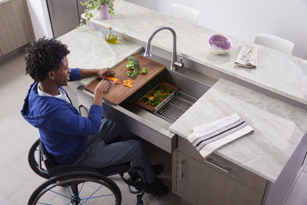 Elkay debuted the new Dart Canyon ADA dual-depth sink, shown here, which allows for tasks to be completed by someone in a wheelchair. A reversible rack in the bottom of the basin can change the height. Flipped one way, it is higher to accommodate someone who is seated. Flipped the other way, it accommodates tall pots. This setup also works well for kids who want to contribute their skills in the kitchen.