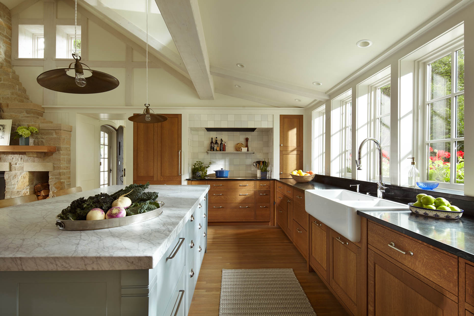 Other special features. White patterned granite island countertop. Soapstone perimeter countertops. Bleached and whitewashed fir beam work. Varying white tile backsplash. Minnesota quarried limestone fireplace. White bronze cabinet hardware. White oak flooring.
