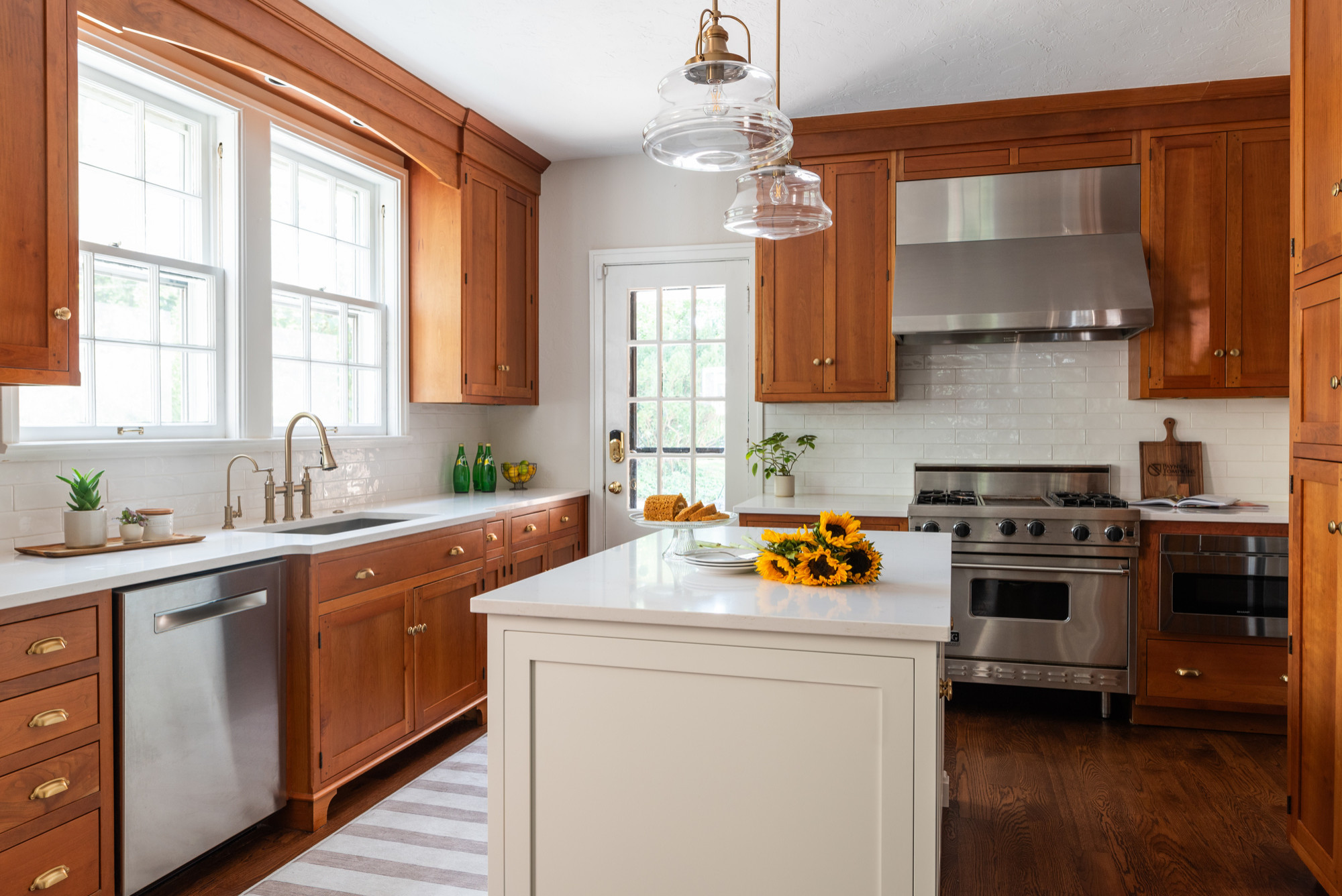 Wood cabinets. “The wood cabinets you see are all existing,” Bergstedt says. “They are a stained cherry and we decided to keep them because they were in great shape and also kept the authenticity of the home intact. When we decided to put in a new island with cabinet storage underneath, we selected Sherwin-Williams Pure White for the cabinet color. Choosing a white paint color updated the space but also gave it a clean baseline where your eyes could follow the movement of the cherry cabinets and come back to the island, where they cook and bake and spend a lot of time together as a family.”