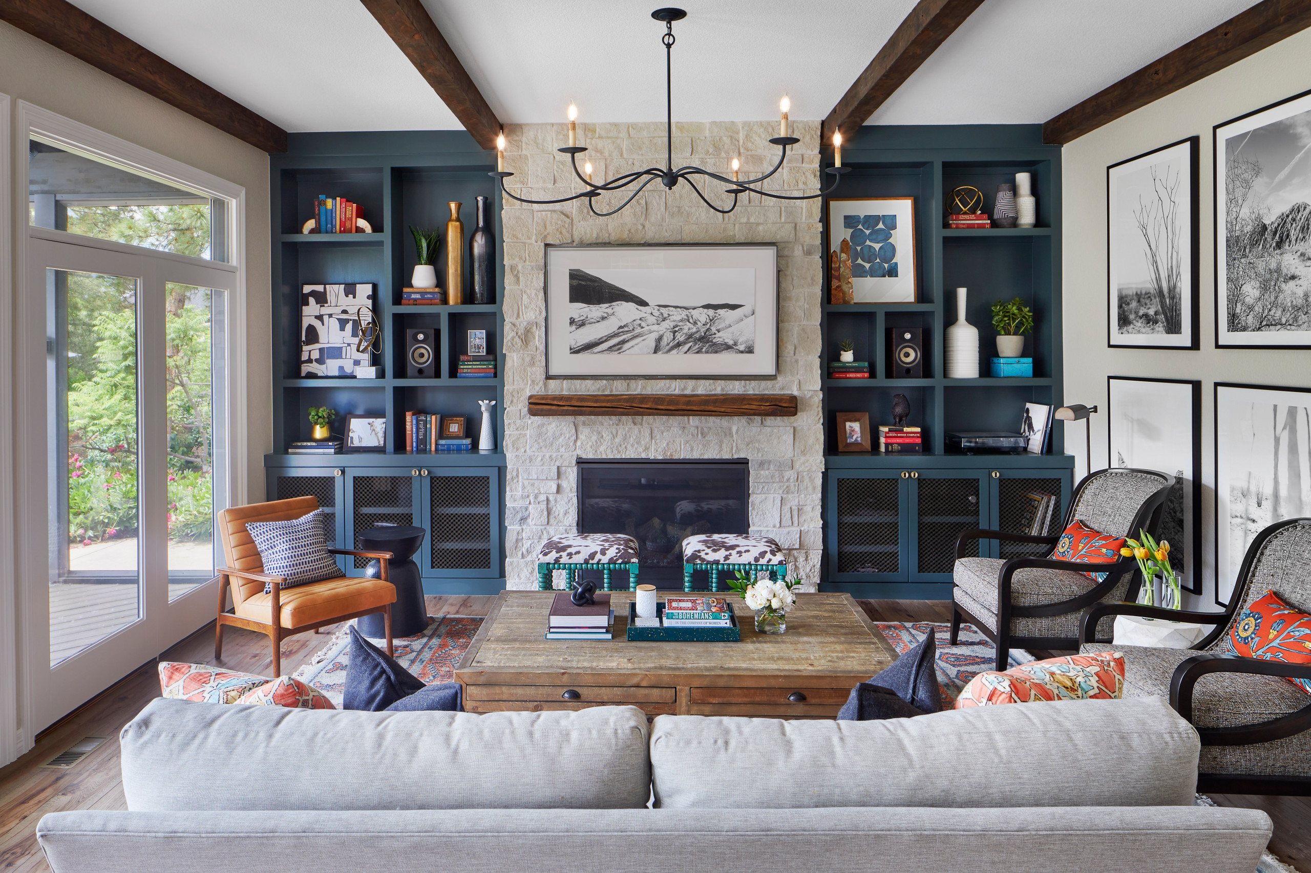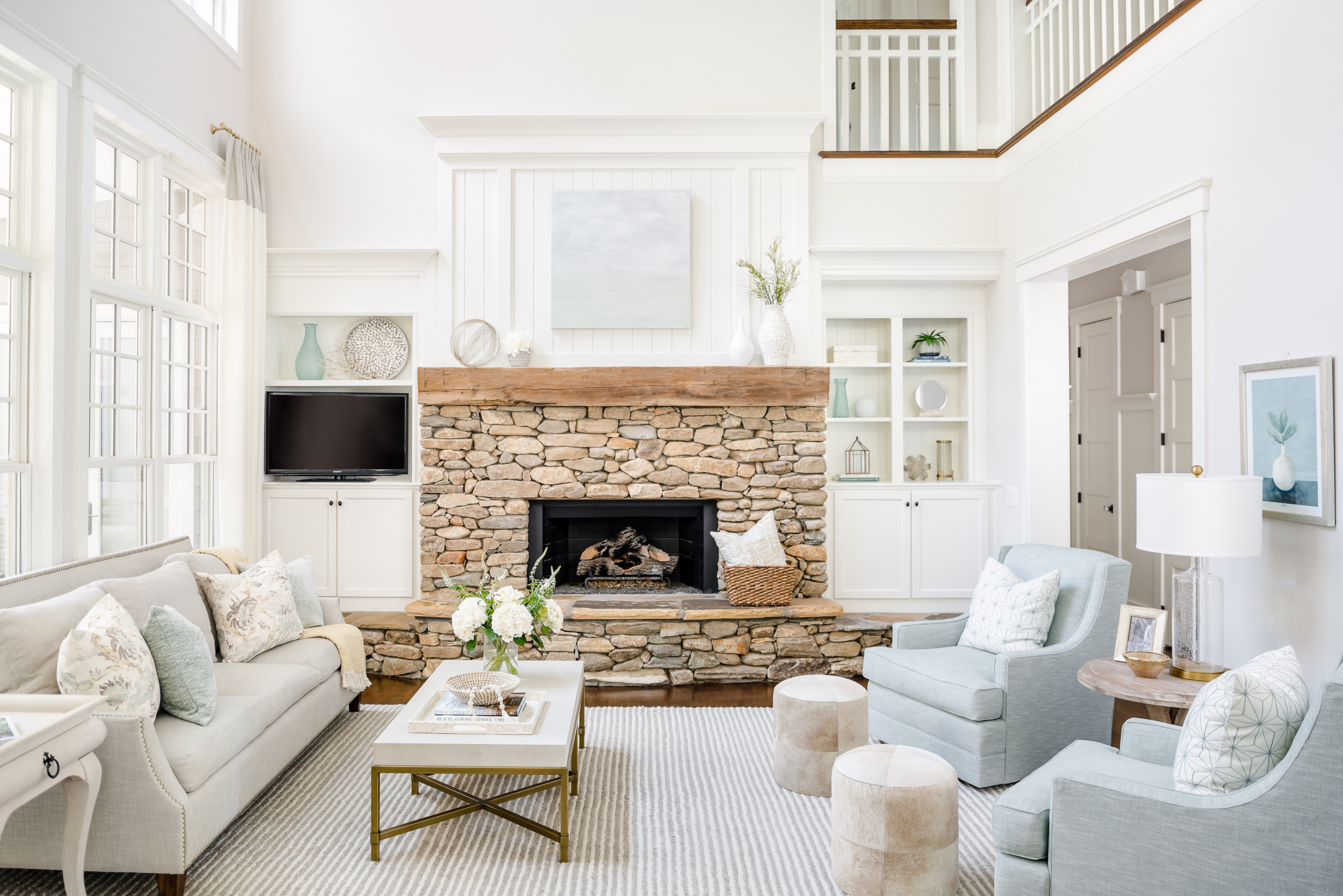 Main feature. “The fireplace is the main focal point of the room, so we let that be the feature and kept furnishings and decor on the neutral side,” designer Ally Whalen says.
