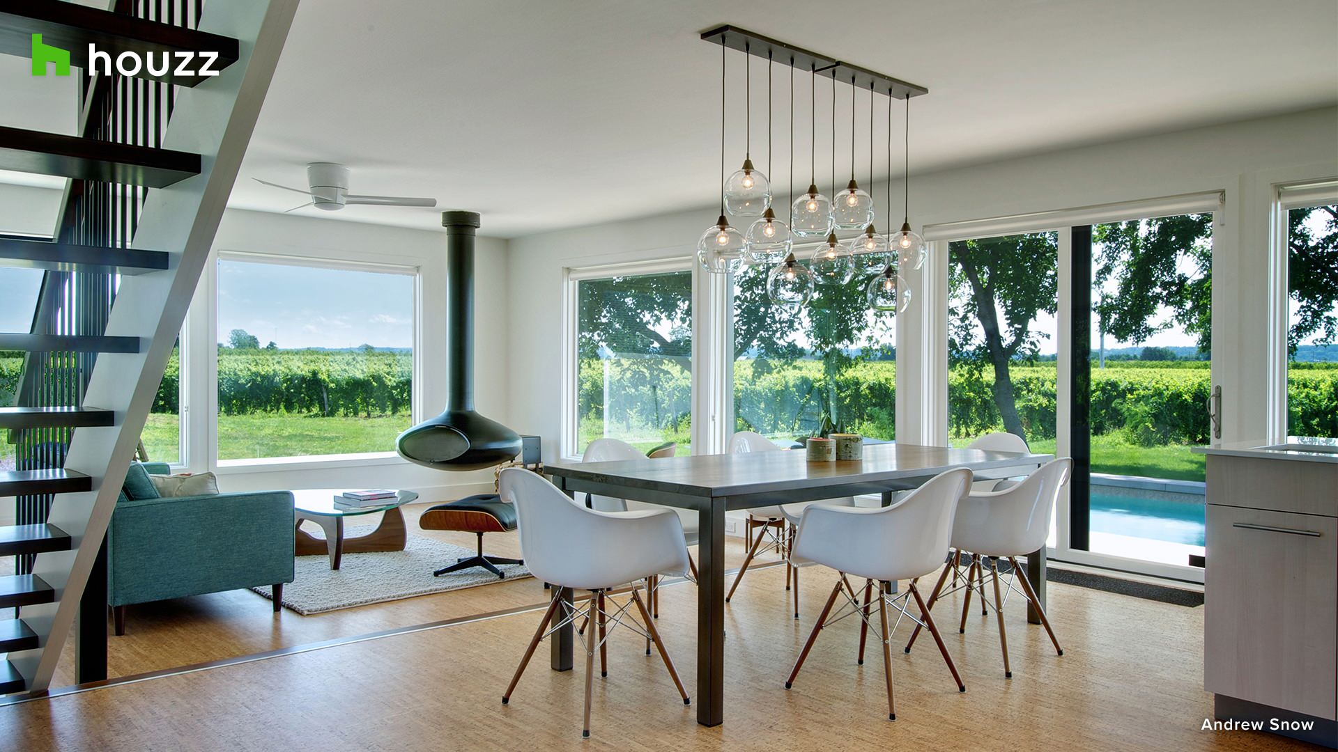 This midcentury modern living room in Canada’s Niagara wine region enjoys scenic views of a backyard vineyard of Chardonnay grapes.