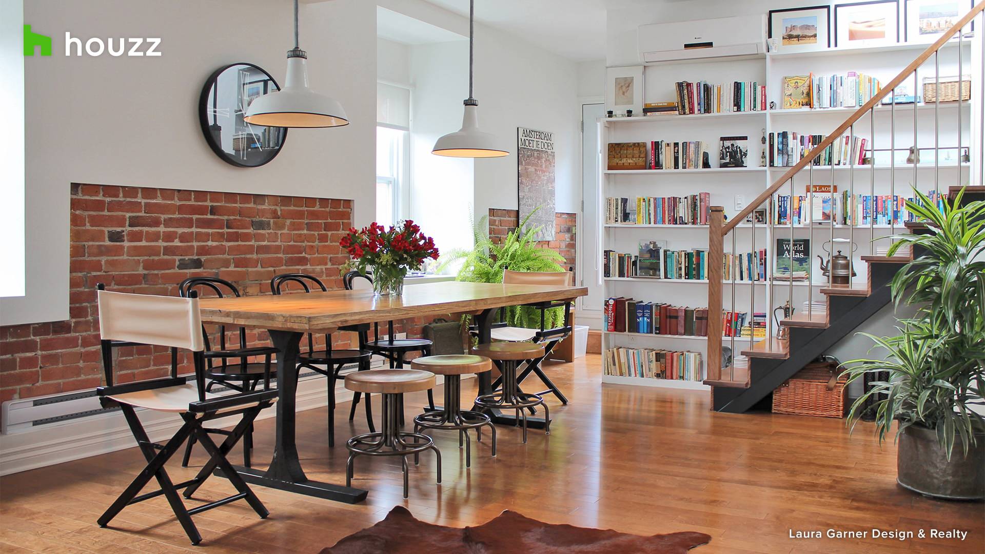 If your style leans industrial and you’re drawn to original architectural details like exposed brick, this renovated urban condo background is for you. The trendy dining room is in a 19th-century converted sewing machine factory in the hip Saint-Henri neighborhood of Montreal.