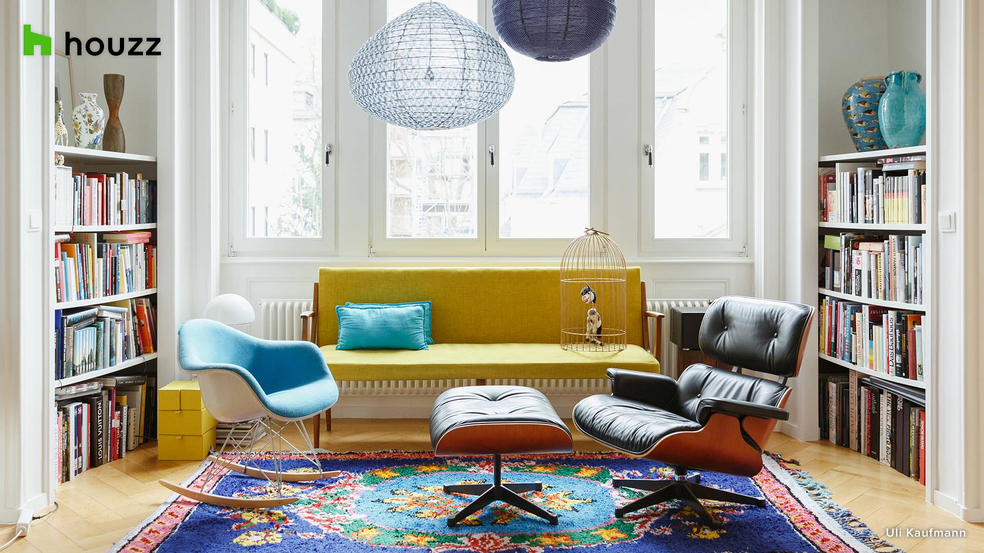 Perk up your space with this eclectic and colorful living room scene belonging to a clothing boutique owner’s family in Frankfurt, Germany. The vintage yellow sofa is highlighted by a backdrop of windows that let in just the right amount of natural light.