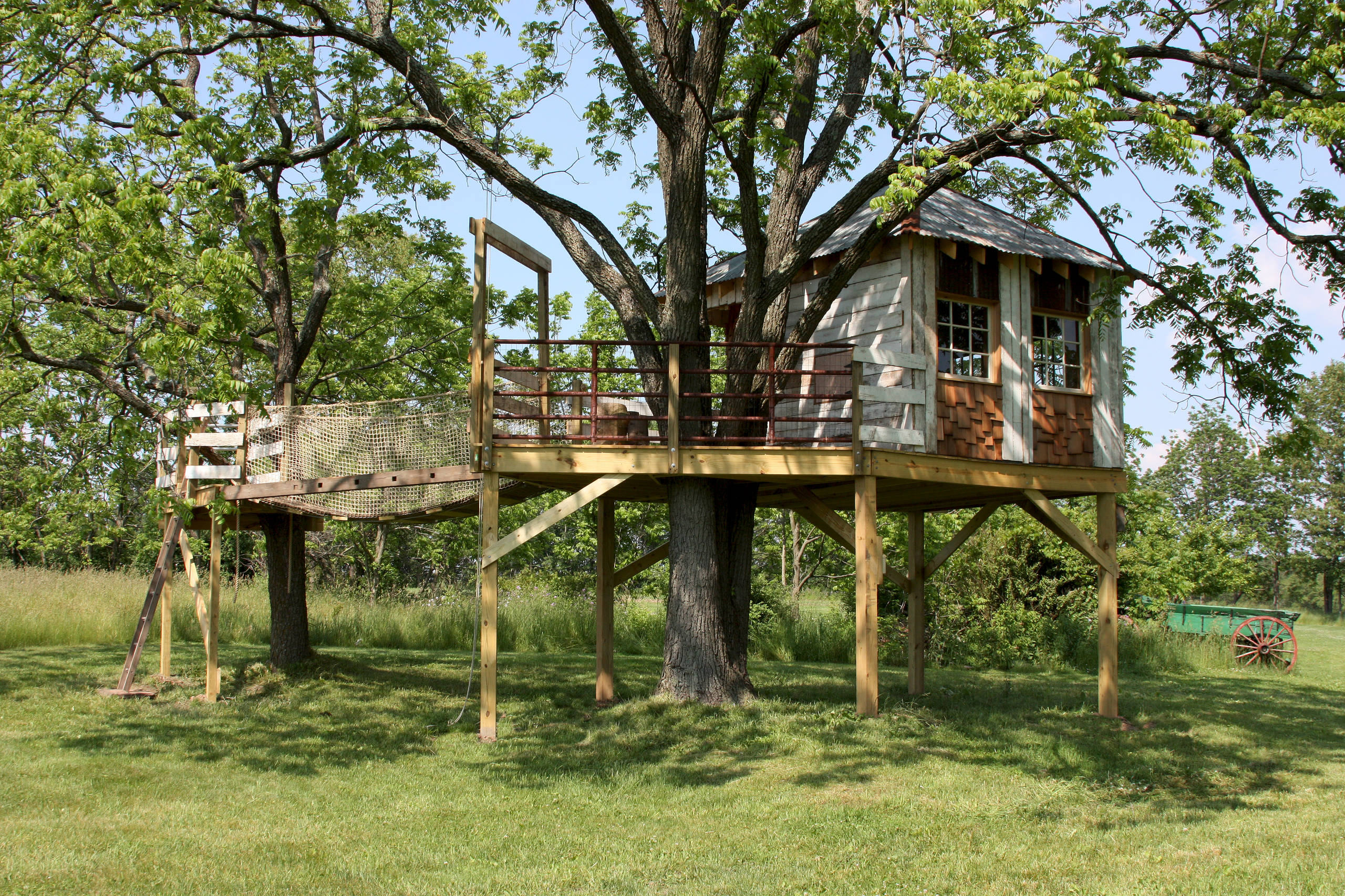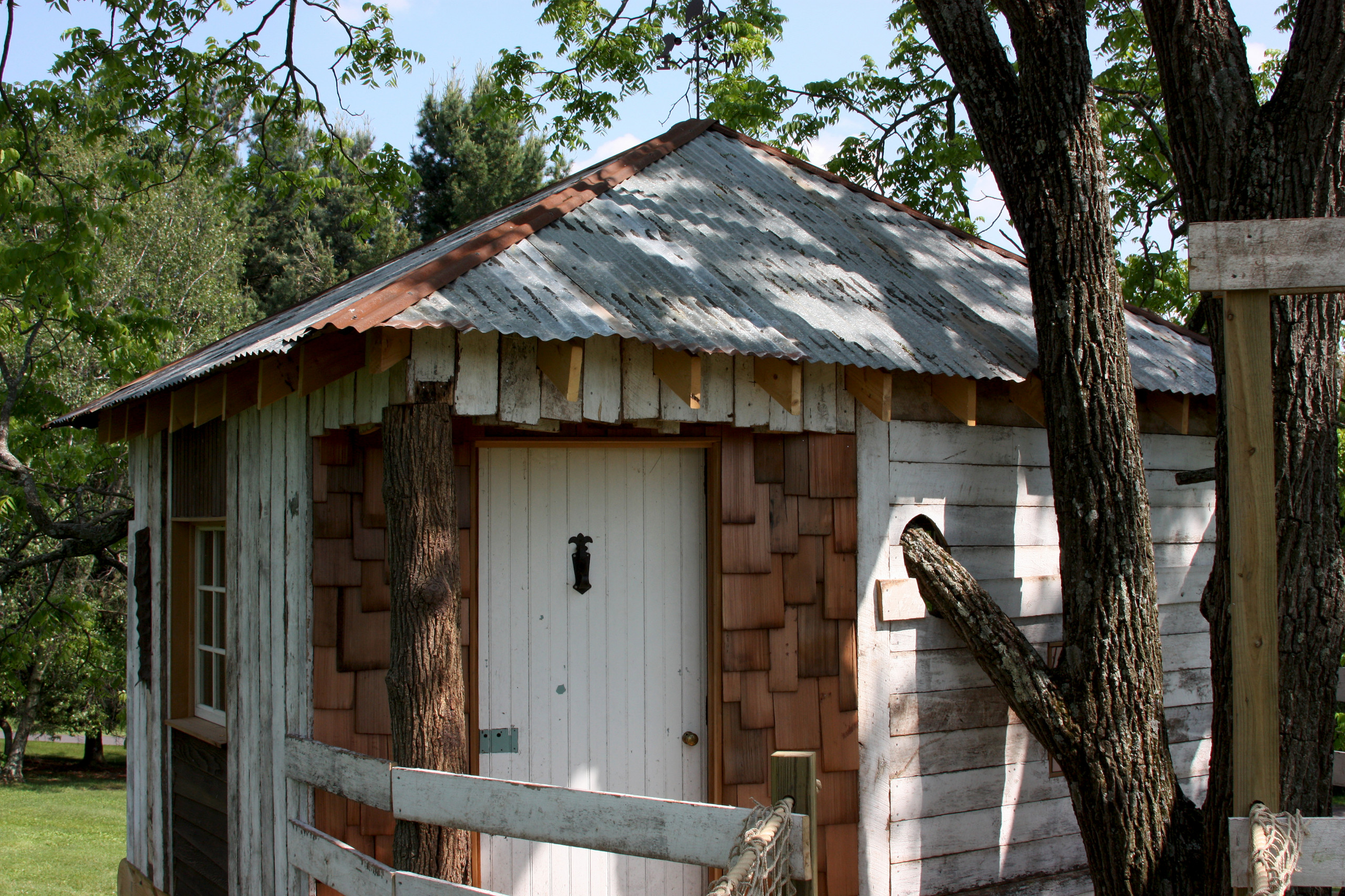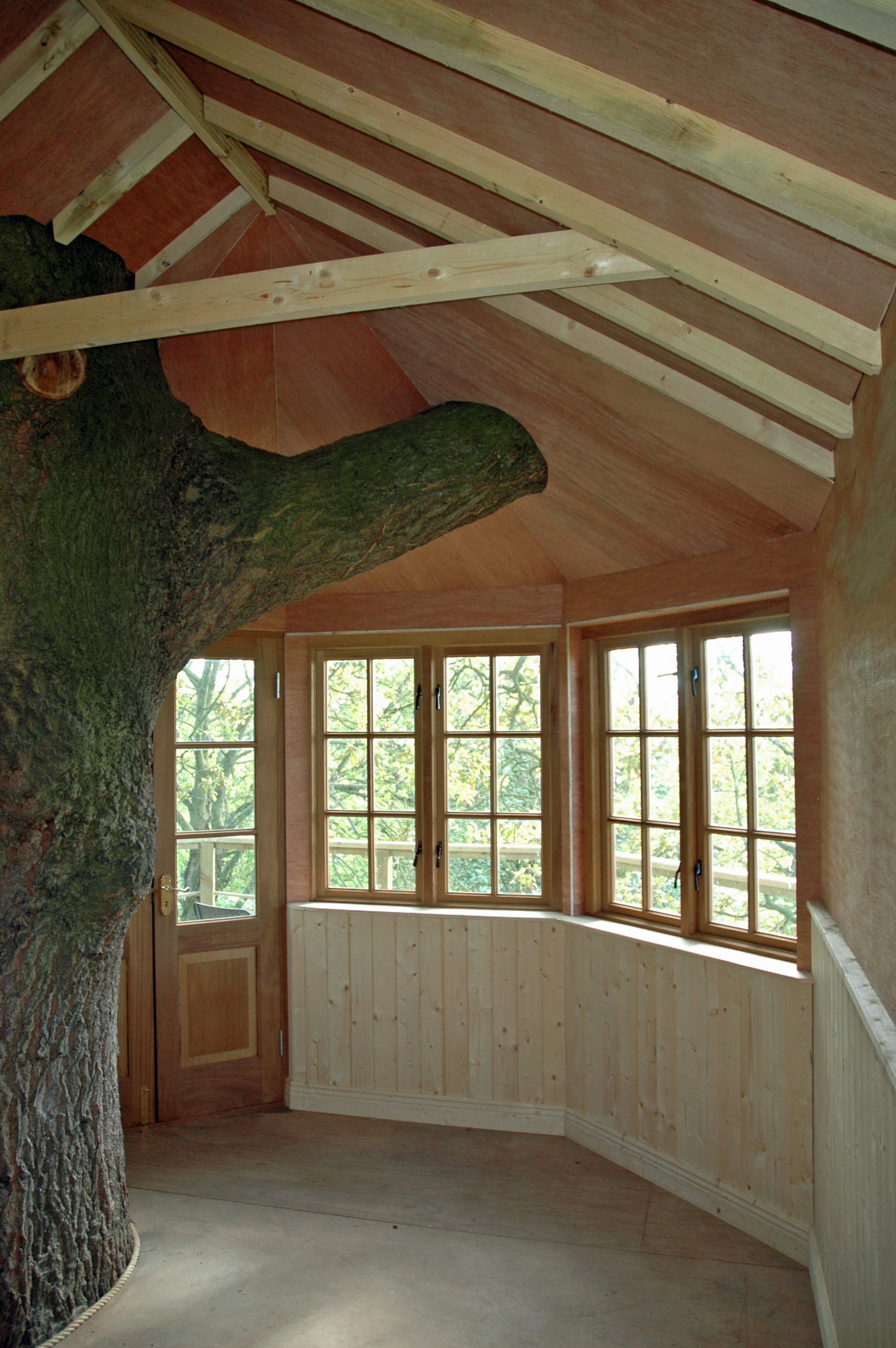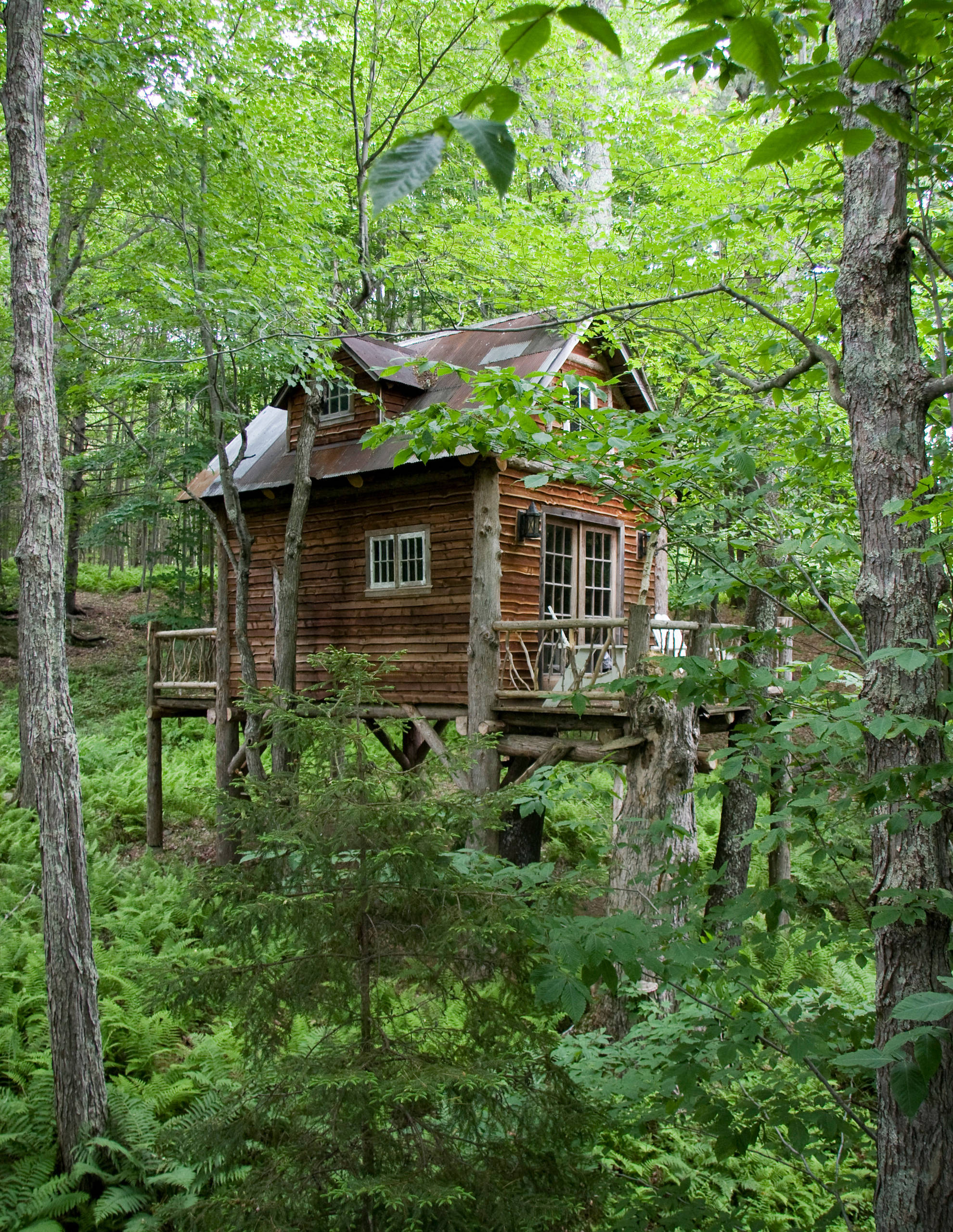 The structure was built around a mature tree but is self-supported on pressure-treated posts. A generous hole cut in the deck for the tree trunk and additional holes cut through two sides of the house for a lateral branch allow the tree to continue growing up and around the structure.