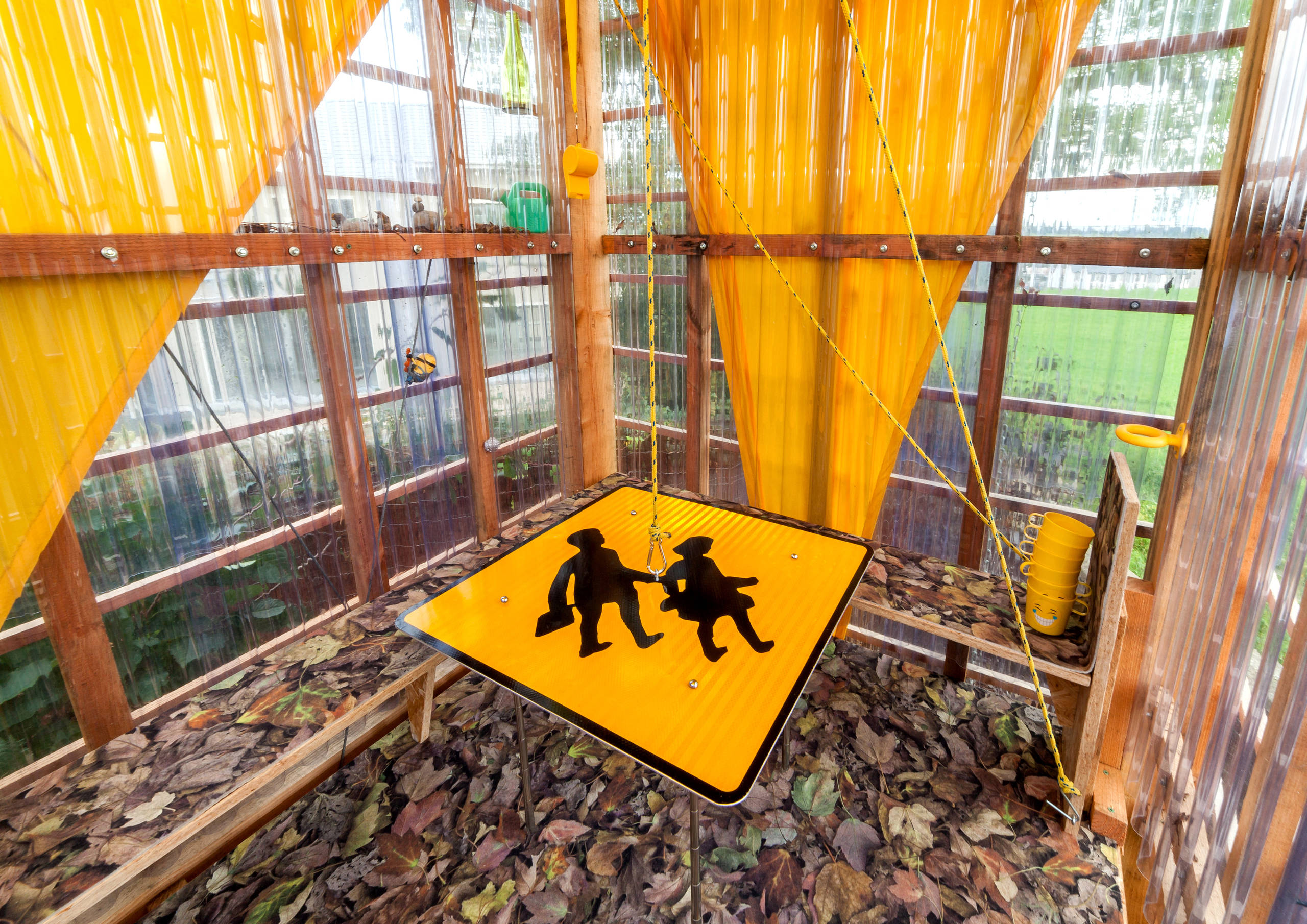 The floor of the treehouse, covered by Flotex flooring in Autumn Leaves, was designed to mimic a natural forest floor. Kane constructed the table from a school road sign and selfie sticks as legs. The legs can be collapsed and the table drawn up on a pulley system to clear the floor space for play.