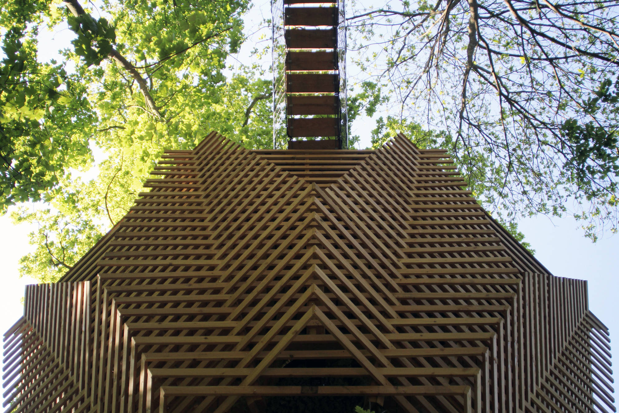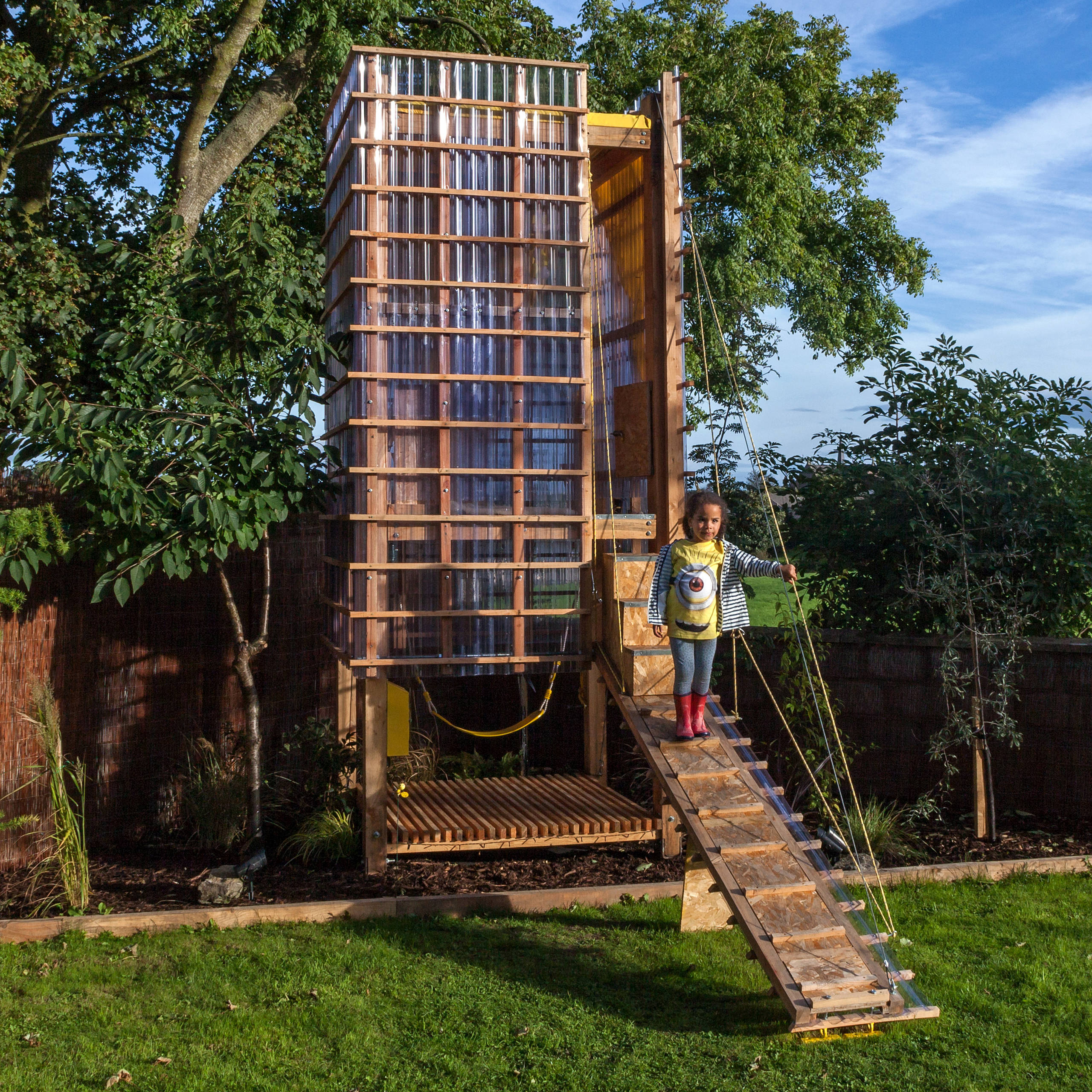 Built out of untreated Irish larch wood and clear acrylic corrugated sheeting, the award-winning play tower (measuring roughly 5 feet wide and 14 feet tall) has the lofted feel of a treehouse and a clear view of the growing landscape trees.
