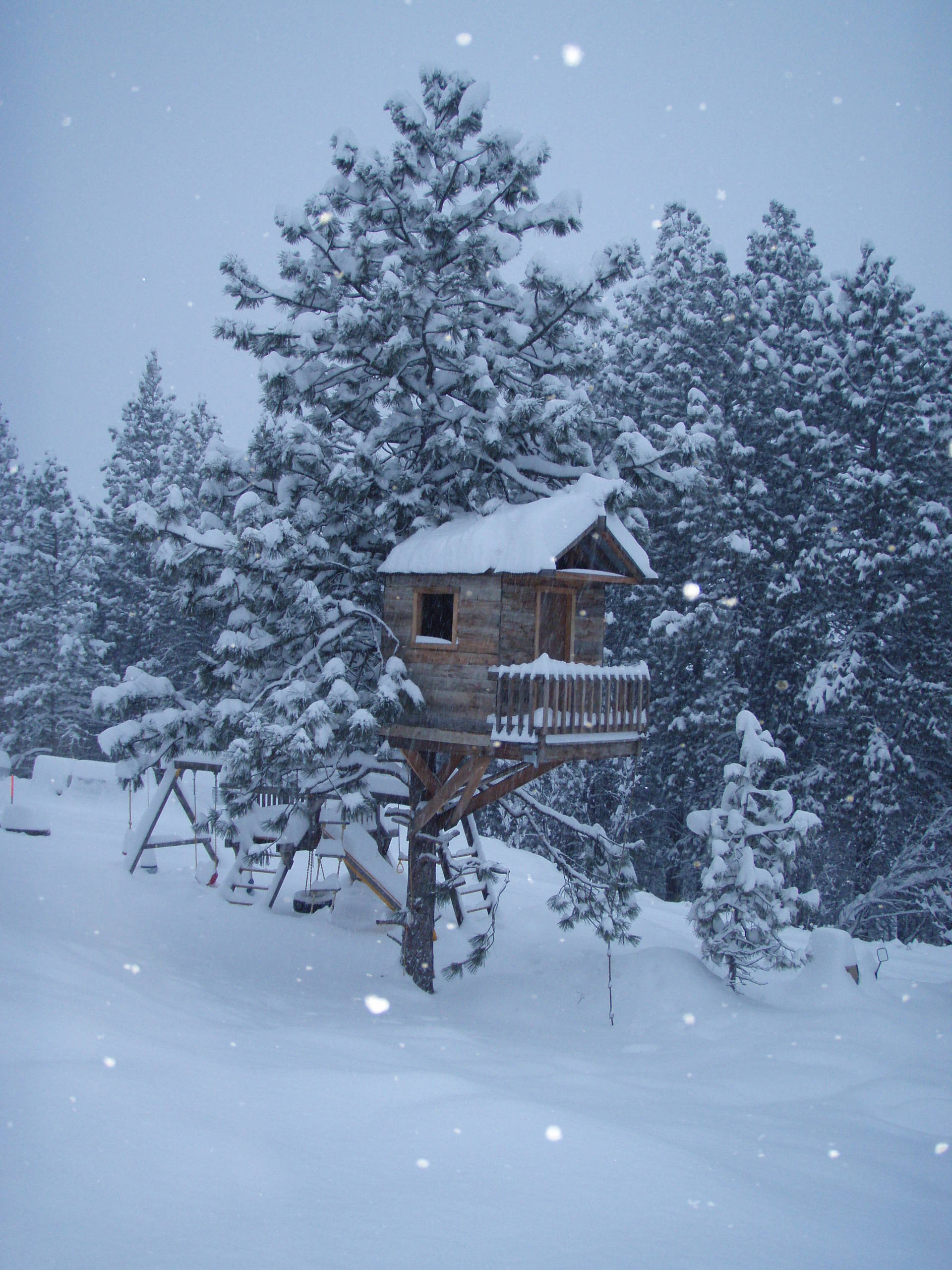 Lofting the treehouse high off the ground provided space for a slide, a set of hanging rings and a tire swing for the girls to play on. In winter, one could imagine that the raised structure would be the perfect spot to lob snowballs from.