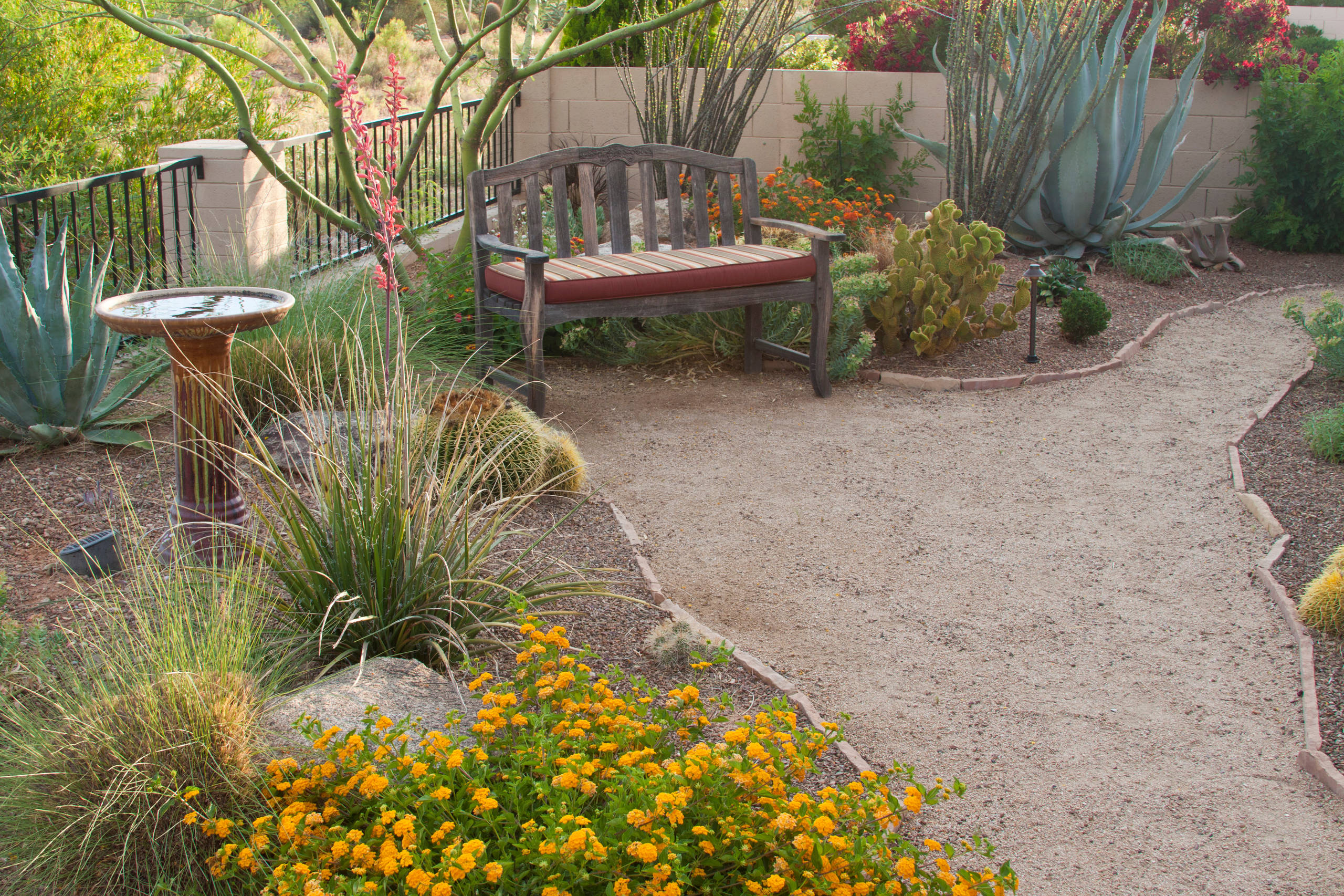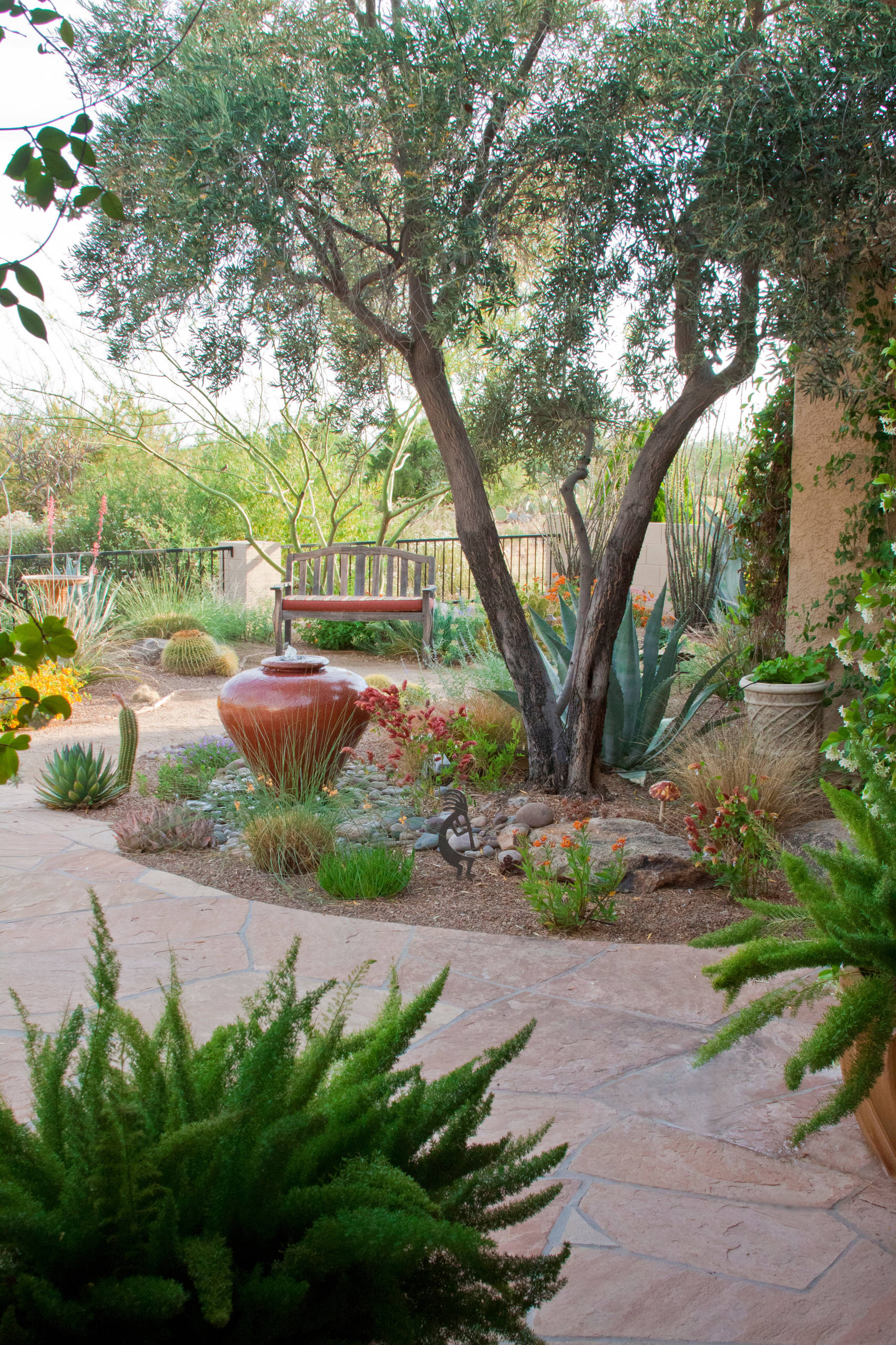 5. Desert oasis in Arizona. Providing a reliable water source for wild birds, bees and insects is as important as choosing plants that will help provide them with food sources. The designer of this arid garden in Arizona laid out beds to include two sources of water: a shallow birdbath and a recirculating urn fountain.