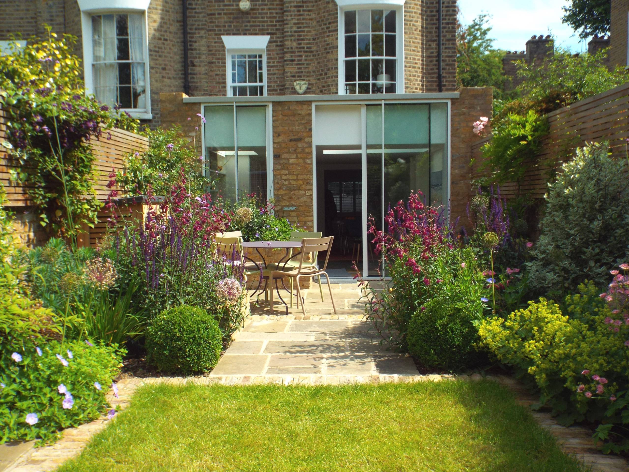 4. Colorful urban garden in London. To wild birds, bees and butterflies, this lush, colorful flower garden in East London looks like a safe, food-rich haven. While the designer used some evergreens for structure and reserved room for a small patch of turf, the majority of garden bed space was reserved for pollinator-friendly plants like ‘Blackbird’ penstemon (a hummingbird favorite), bee-attracting ‘Caradonna’ sage, pink masterwort and ‘Rozanne’ cranesbill.