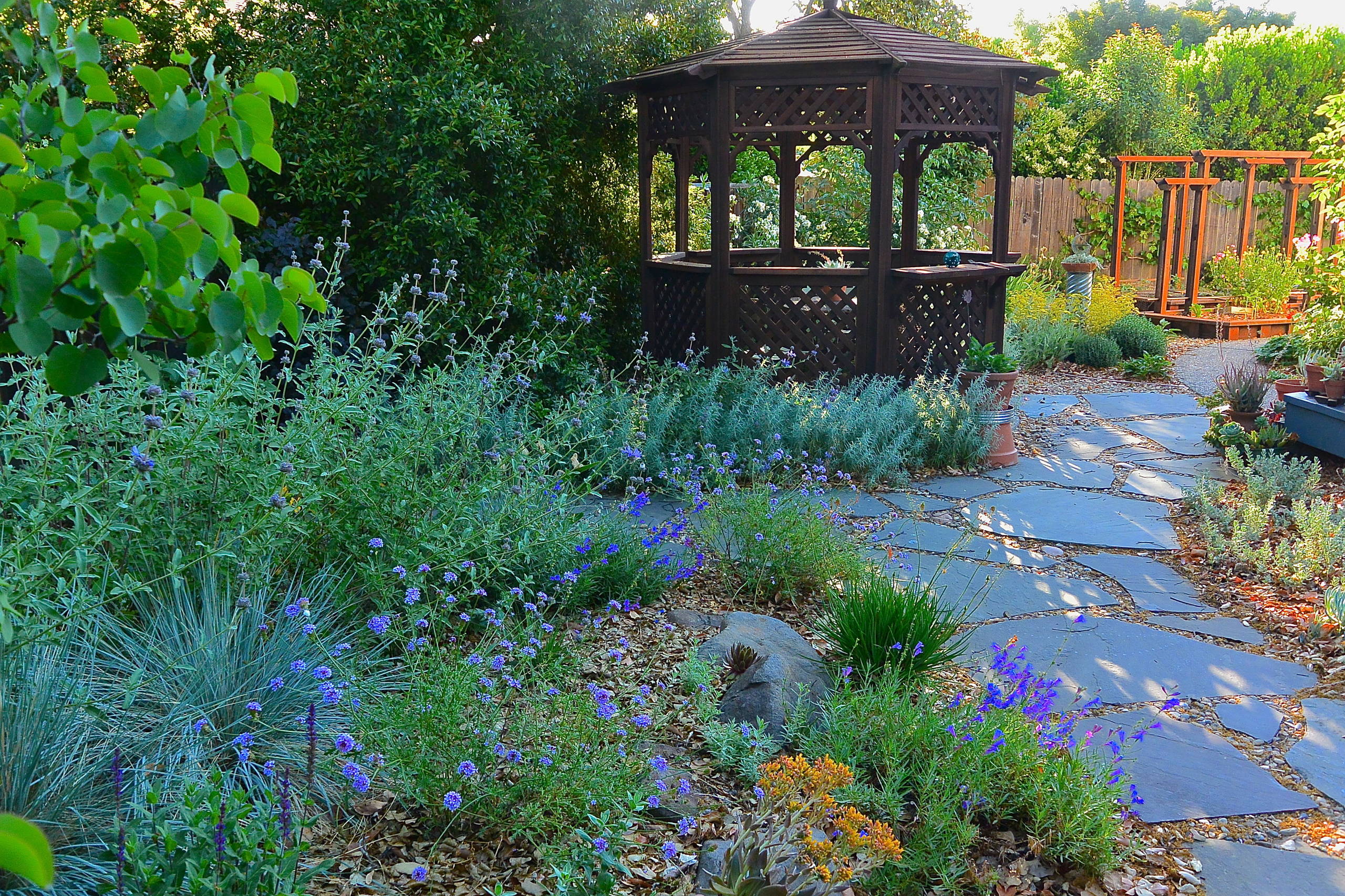 6. Native plant garden in Northern California. Drifts of California native flowers, such as lavender-blue Cleveland sage and foothill penstemon, create a colorful, low-water border in this Northern California backyard centered around a wooden gazebo.