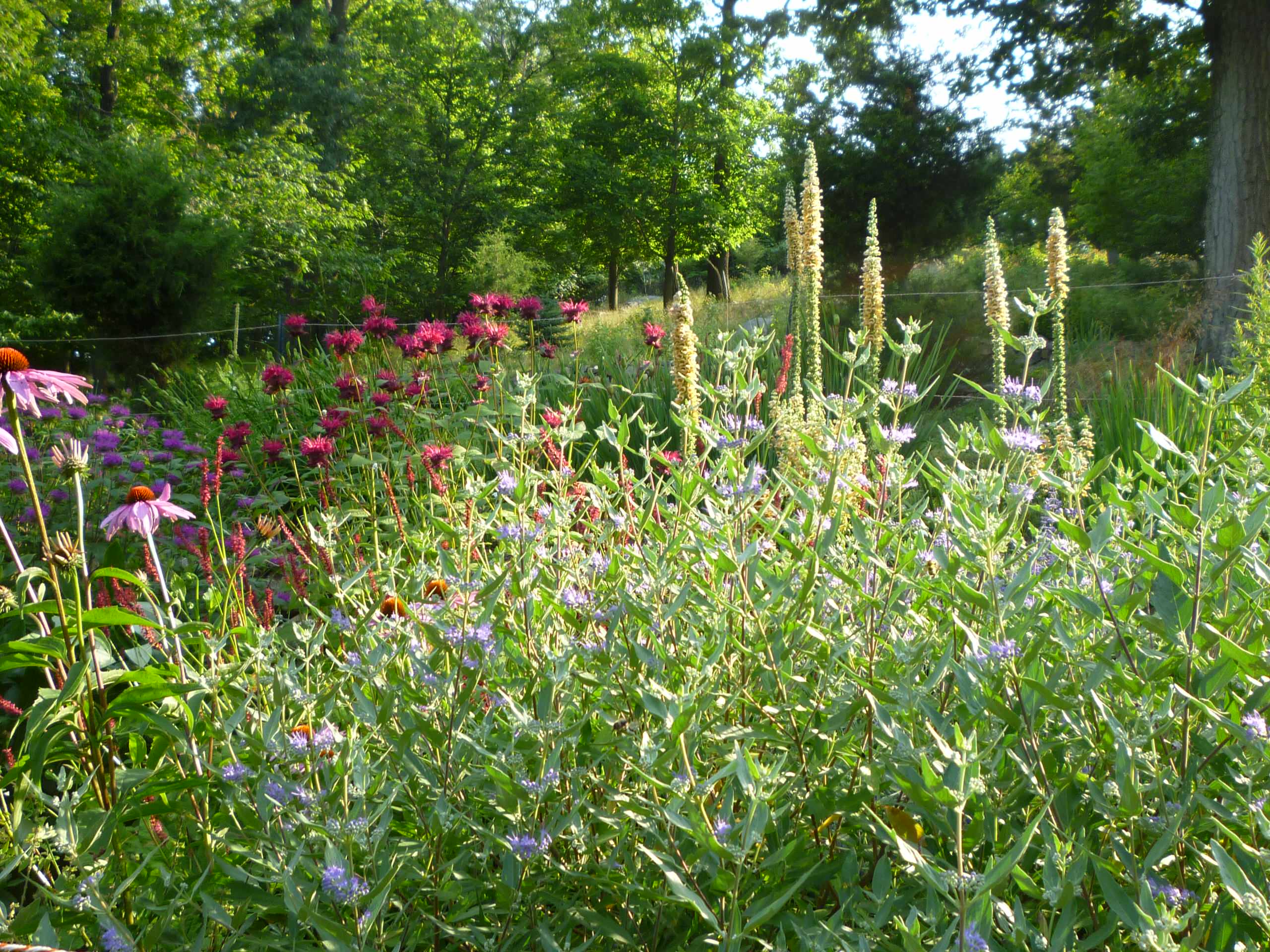 3. Wild garden in New York. This pollinator garden bordering woodland in New York provides a colorful landing spot for native birds, bees, butterflies and other insects. The designer used a mix of North American natives like beebalm and coneflower and introduced species like bluebeard — a bee magnet — and butterfly bush.