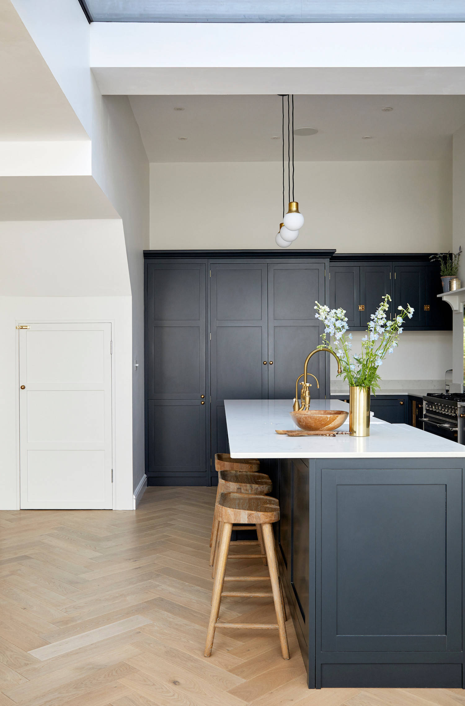 In this kitchen, the classic white wall tiles and the pale gray flooring highlight the dark gray cabinets and the black architectural features beautifully. Brass handles, meanwhile, bring out the richness of the charcoal hue.