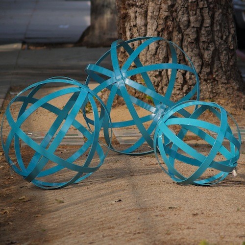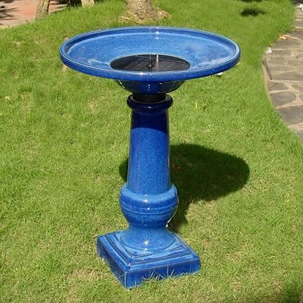 A bird bath in a bold blue adds a large bolt of color. This birdbath not only is pretty, but it's a unique find because it includes a solar-powered burble fountain.
