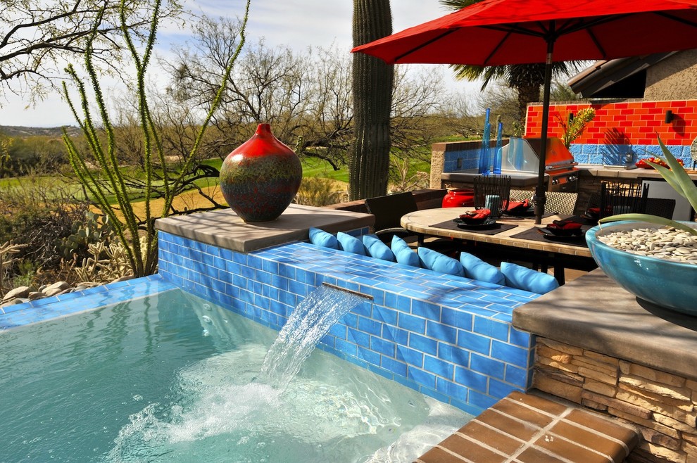 6. Fire and ice. Mix heated reds with cool blues for a powerful tropical feel. If you are planning to add tile to your outdoor area, incorporate your bold color into it rather than staying neutral.