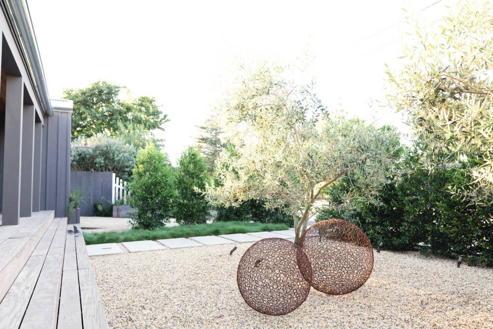 Inside the hedges, the front yard includes a private gravel courtyard, complete with an olive tree and metal globe garden art. If total seclusion is a goal, choose a hedge plant with dense foliage growth, such as arborvitae (Thuja occidentalis), Carolina laurelcherry (Prunus caroliniana), shown here, or cherry laurel (Prunus laurocerasus).