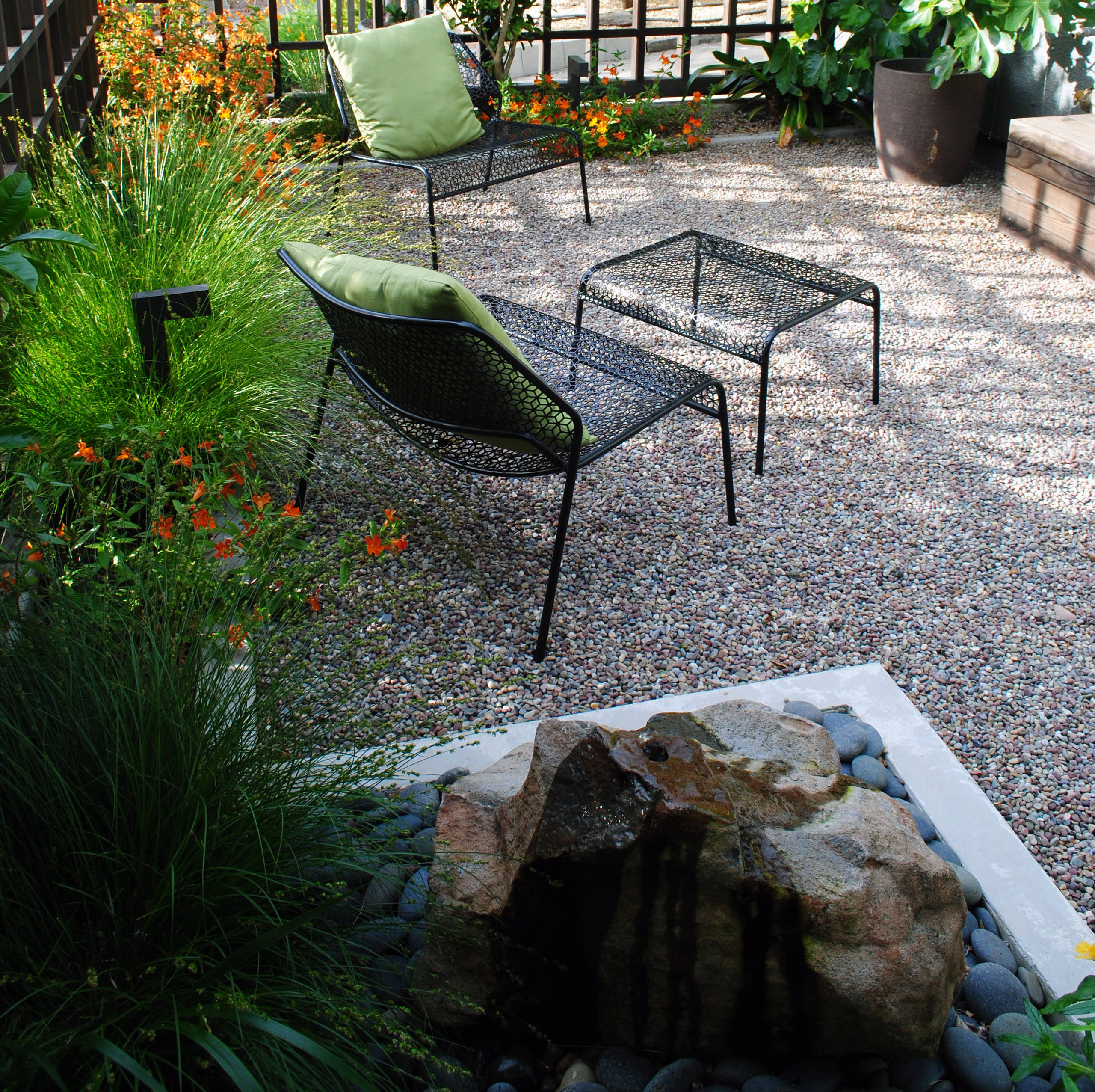 Widely spaced lattice fencing encloses the yard, creating separation from the outdoor seating area and the street while still keeping the yard friendly and more open. To complete the scene, Moore also included a subtle recirculating fountain, seen here on the lower left.