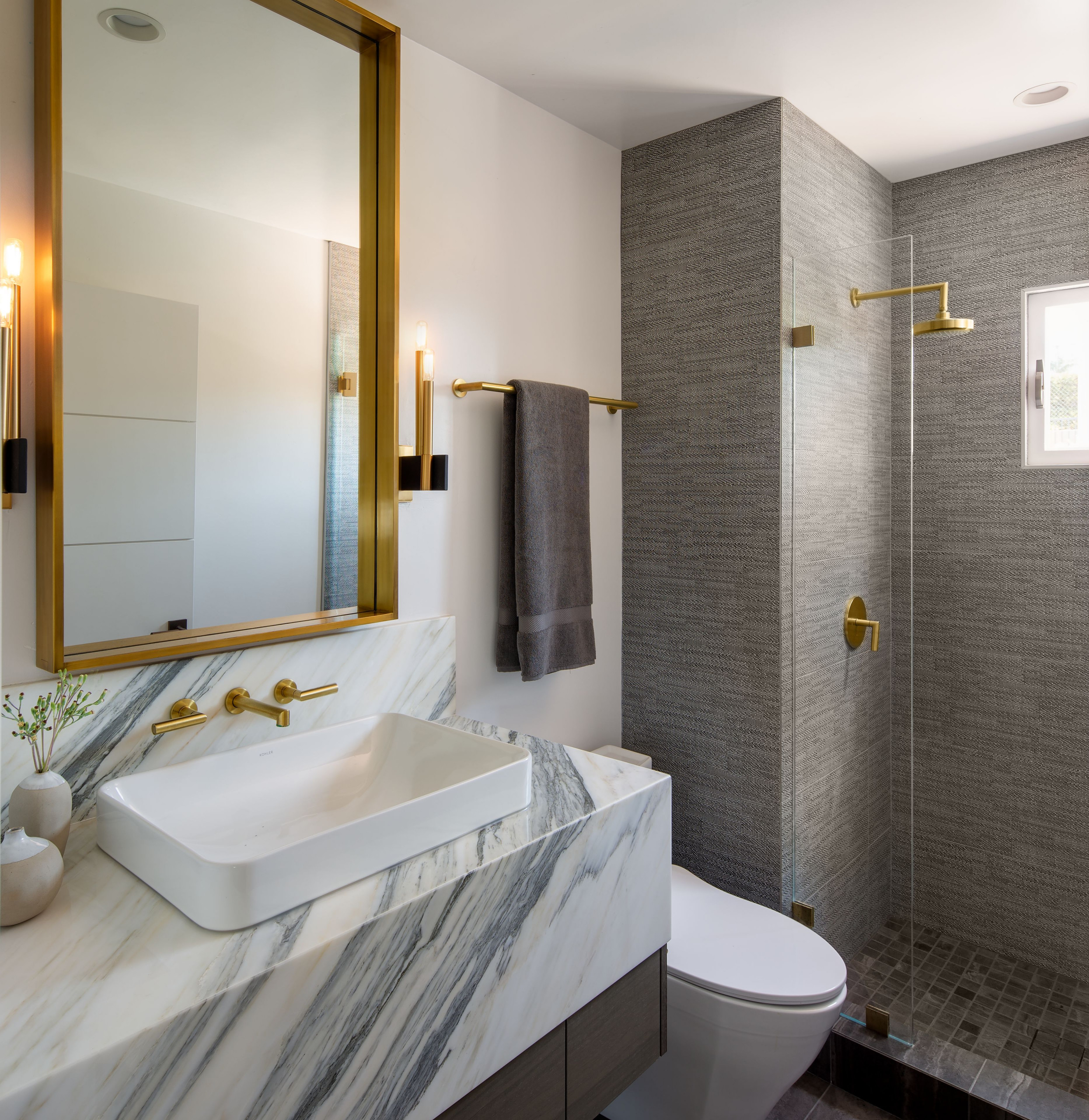Other special features. Marble countertop with exaggerated mitered edges. Walnut floating vanity. “The marble ties it all together and the brass accents give it a touch of glam,” May says.