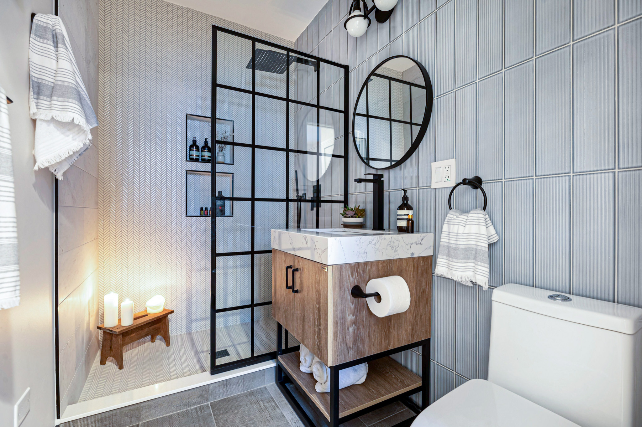 Low-curb shower details. Blue terra-cotta tiles in a vertical pattern line the shower walls, curb and shower entry wall. The flooring is white zellige octagon tile with a black square detail pattern. Concrete-look quartz tops the curb. “Logistics for a curbless shower can get a little more involved with utilizing recessed floor framing to account for the slope and build up,” Marsden says. “In this case, we had a head height issue for the crawlspace access below and collectively, as a project team, decided to embrace the curb and make it a purposeful detail. You can see the wall tile runs continuously under the curb with a slab to match the countertop to finish it off. The end result is a layered look with the contrast between the wall tiles and the floor tiles.”