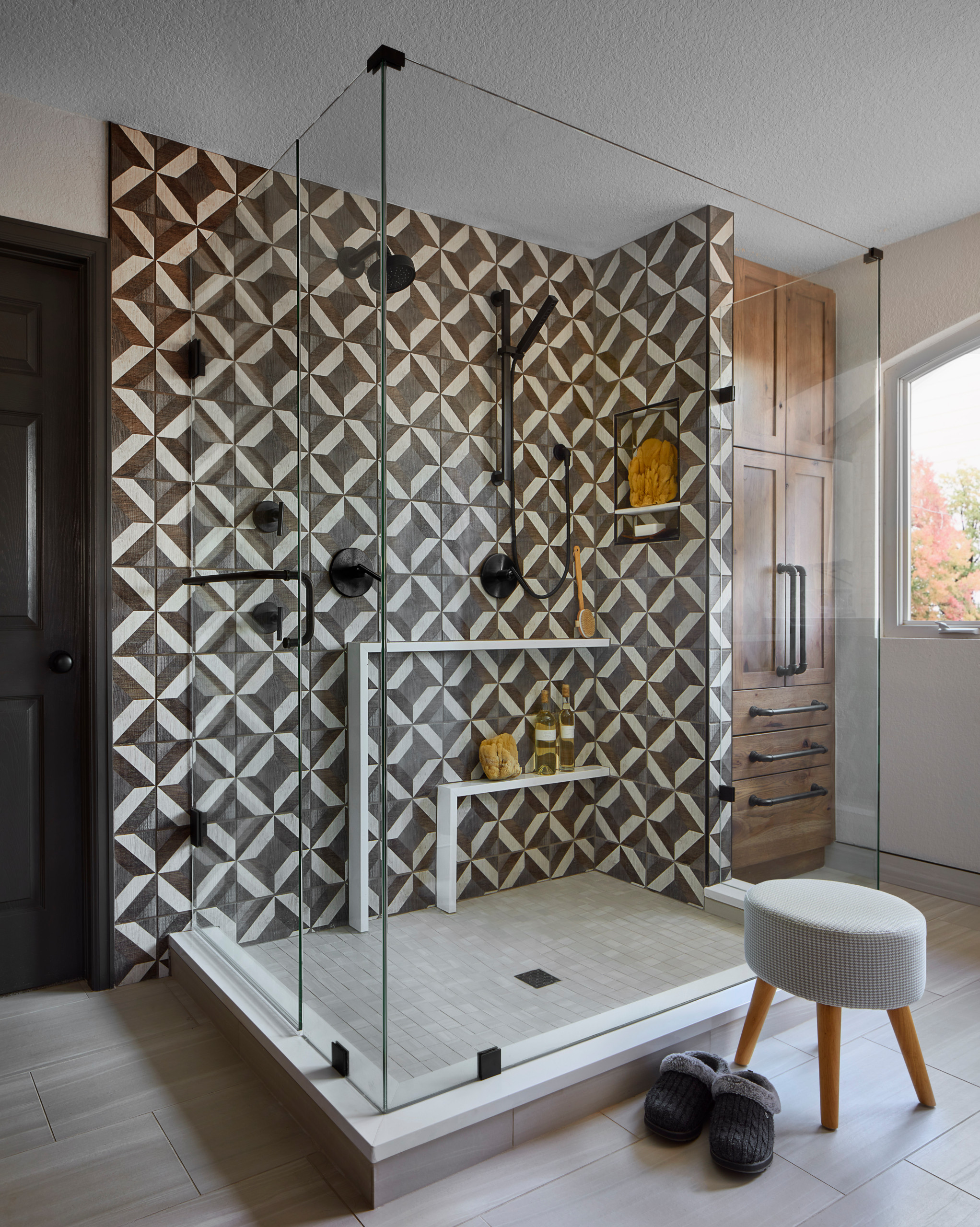 Low-curb shower details. Geometric porcelain tiles with wood-grain look. Three sides of glass. Custom storage ledges, one of which was placed at a height that allows the user to prop a foot up when needed. “Our overall goal was to deliver a functional experience that also hit the visual marks,” designer Lindi Bolinger says. “We accomplished this by creating an oversize walk-in shower with a dramatic geometric tile and separate shower heads for each of the homeowners.”