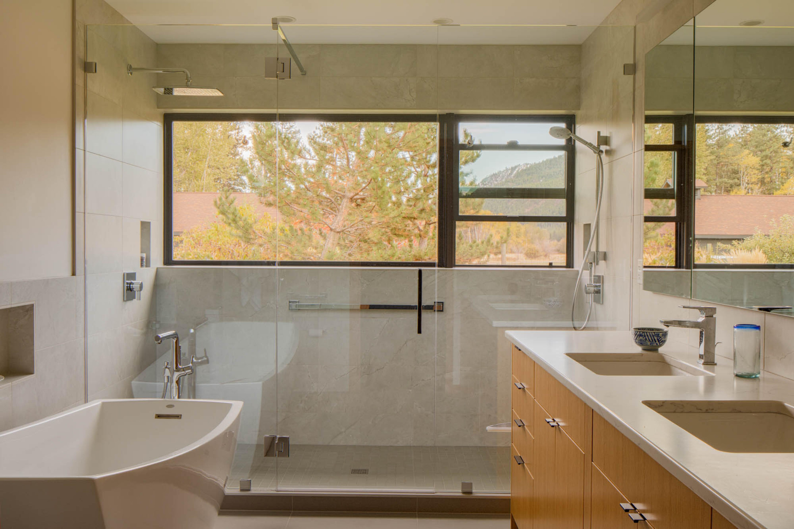 Homeowners’ request. “The owners wanted a light and airy bathroom with a stronger connection to the outdoors,” architect Ray Johnston says. “We made large windows in the shower a focal point with transparent glass doors to let nature shine through the space.”