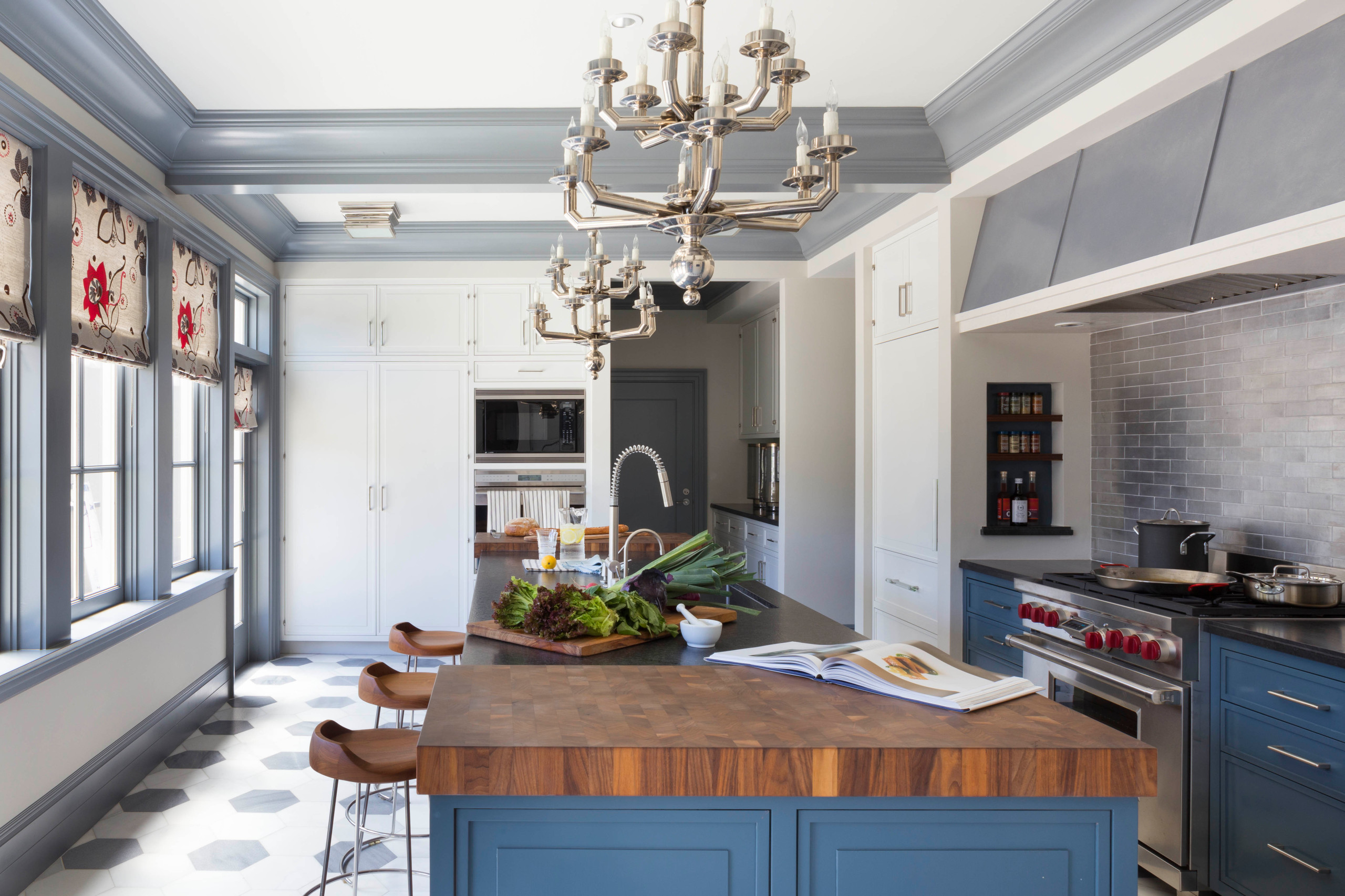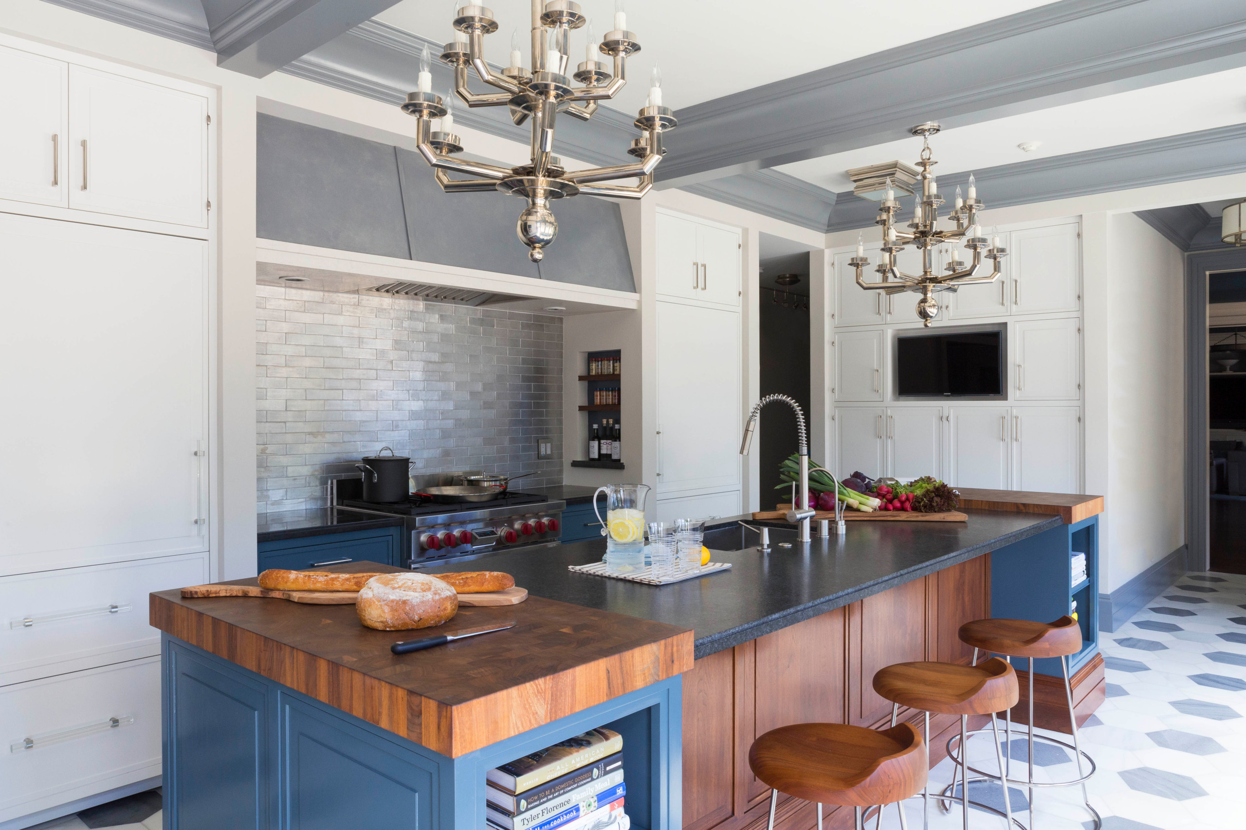 White, wood and blue elements. “Being adjacent to the outdoor space with its pool and landscaped area, the white-and-blue palette was a natural choice,” Tenaglia says. “The walnut elements are predominantly on the butcher block and baseboard of the island. The Oxford White Benjamin Moore cabinets envelop the perimeter of the room, while the Benjamin Moore blue Spellbound-painted cabinetry anchors the core of the space, the island and the cook line. Benjamin Moore Hearthstone was used for the doors, windows, trim and ceiling beams to tie in with the lovely hex white-and-gray machined antique marble floor, a standout feature offering both durability and luxury.”
