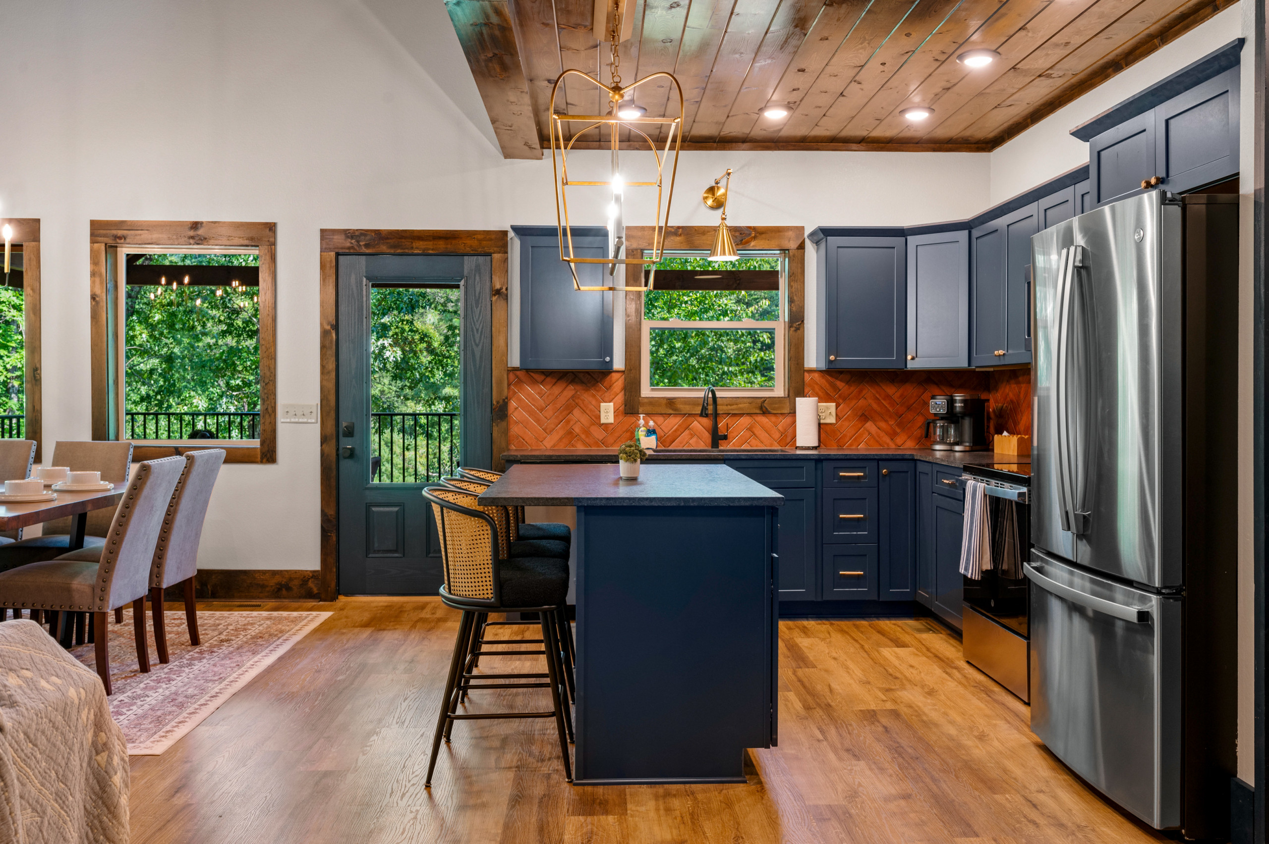 Homeowners’ request. This kitchen was designed in-house by Loomis Construction as part of an update to a short-term rental cabin in the Smoky Mountains. “Our vision for the kitchen and the entire cabin was the bluebird,” says designer Becky Snyder. “We used nature as our color palette.”