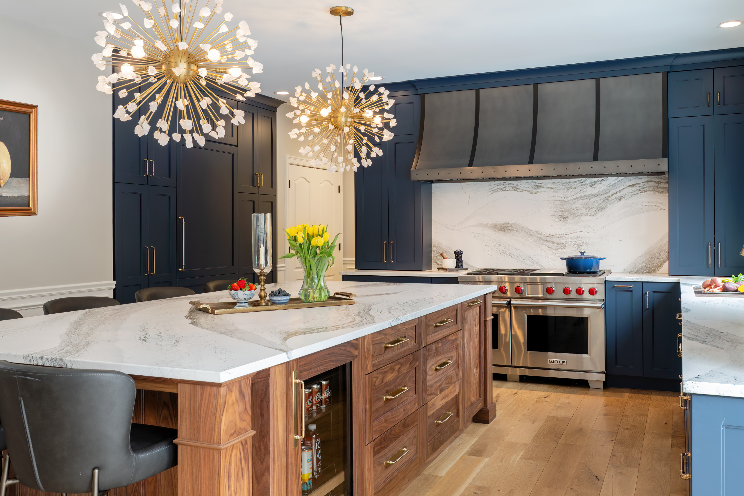 White, wood and blue elements. “This client’s personality was bold, so I knew she’d be open to something other than white for cabinetry,” Nelson says. “Her love for navy blue made it an easy choice to have Benjamin Moore’s Hale Navy chosen as the main cabinet color. The island was done in a beautiful stained walnut. I accented the shelves in the glass cabinets with the same stained walnut. We brightened the space with some contrast in the quartz countertops and backsplash.”