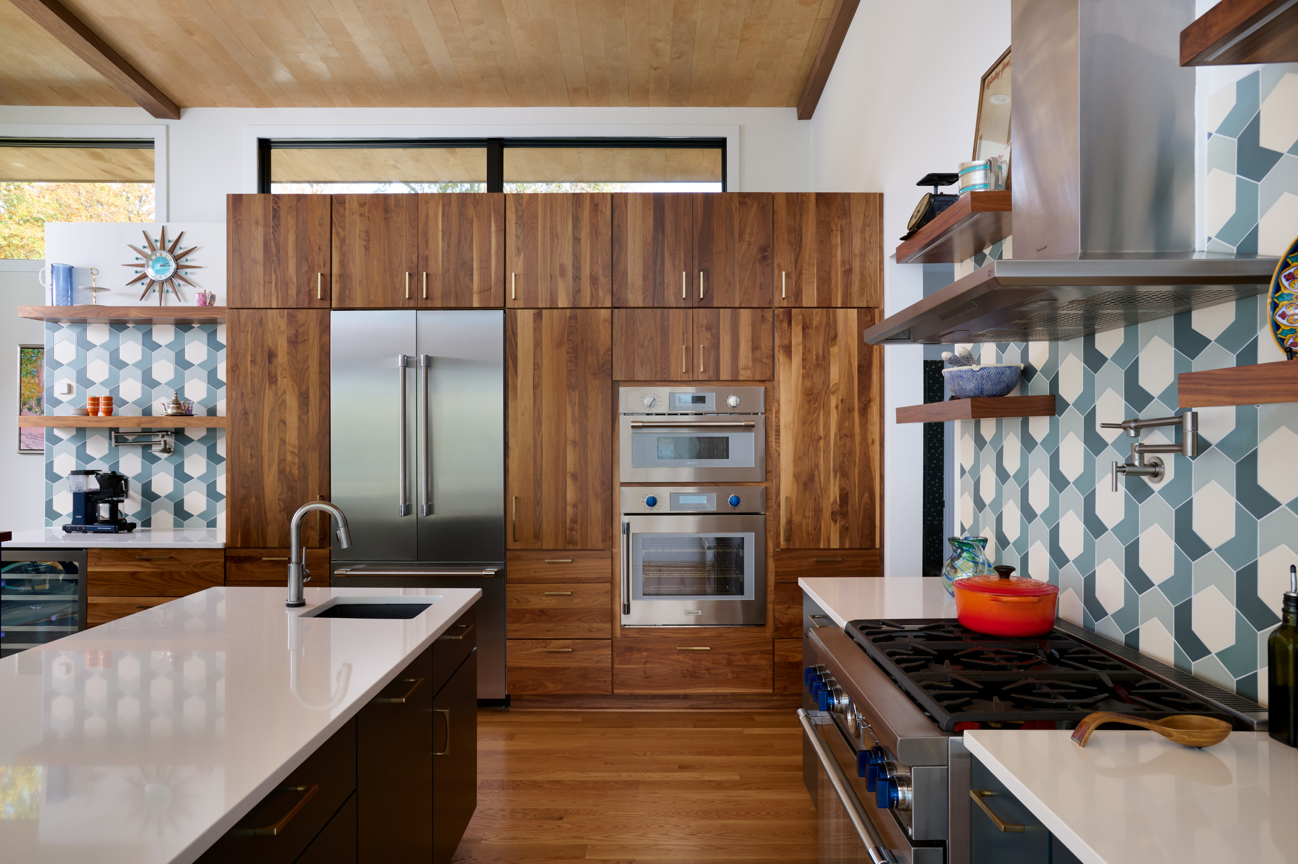 Other special features. “The star of the show in this kitchen is the blue Via collection tile by Clayhaus Tile,” Walters says. “The Louis Poulsen PH5 pendant lamp [previous photo] from Design Within Reach was chosen to match the same shades of blue in the tile.”